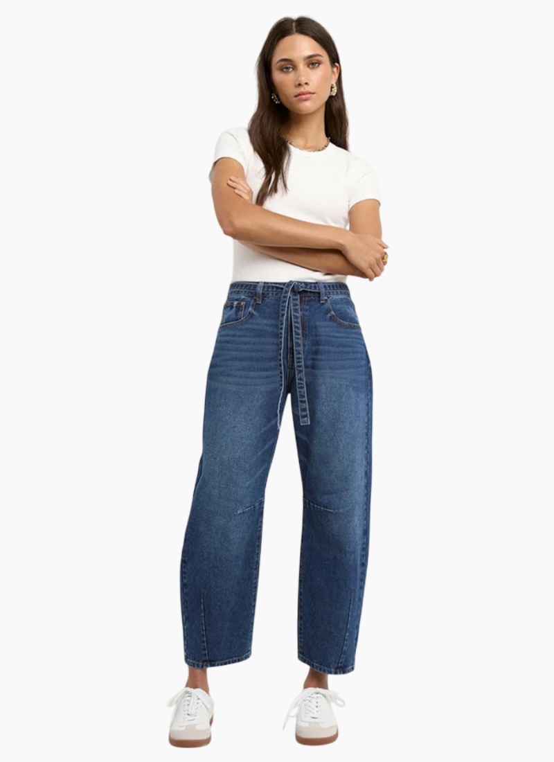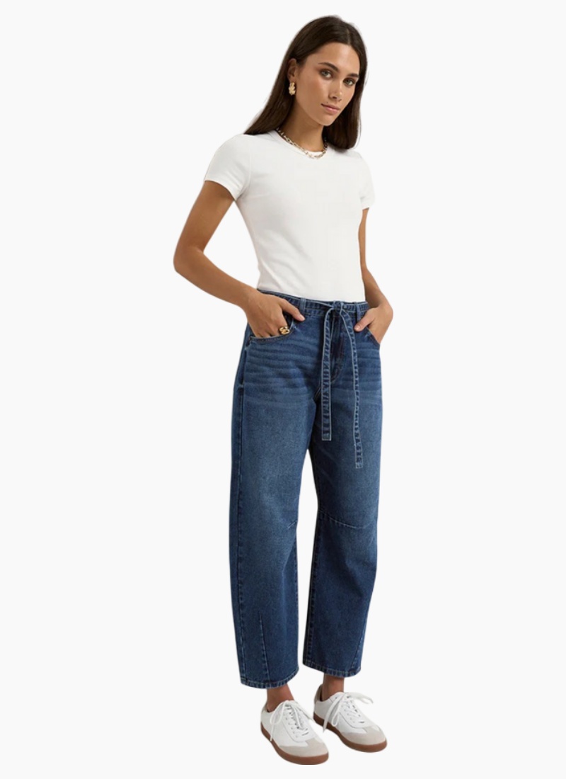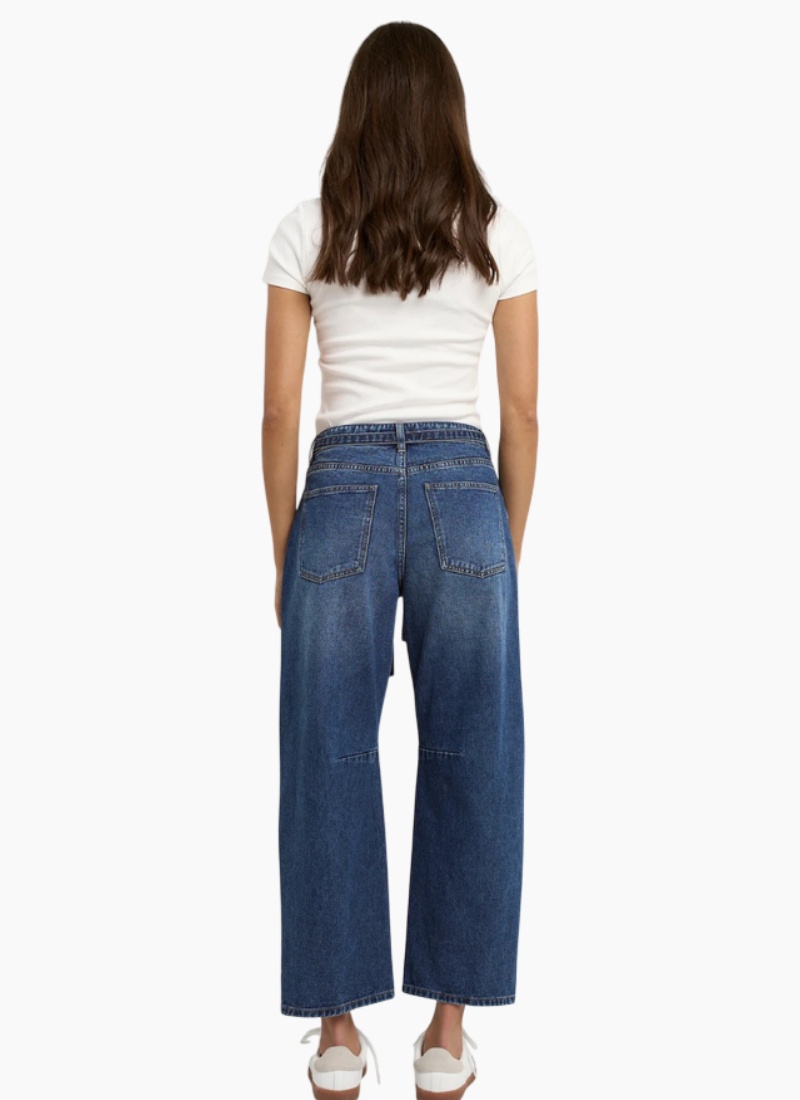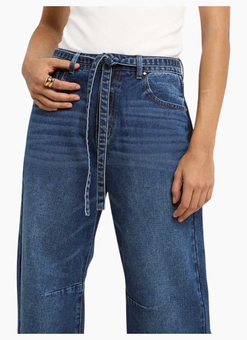 Introducing the Campus Tie Waist Barrel Jeans from Stories Be Told. These deep blue denim jeans bring a relaxed, contemporary silhouette to your wardrobe with thoughtful details and easy styling.