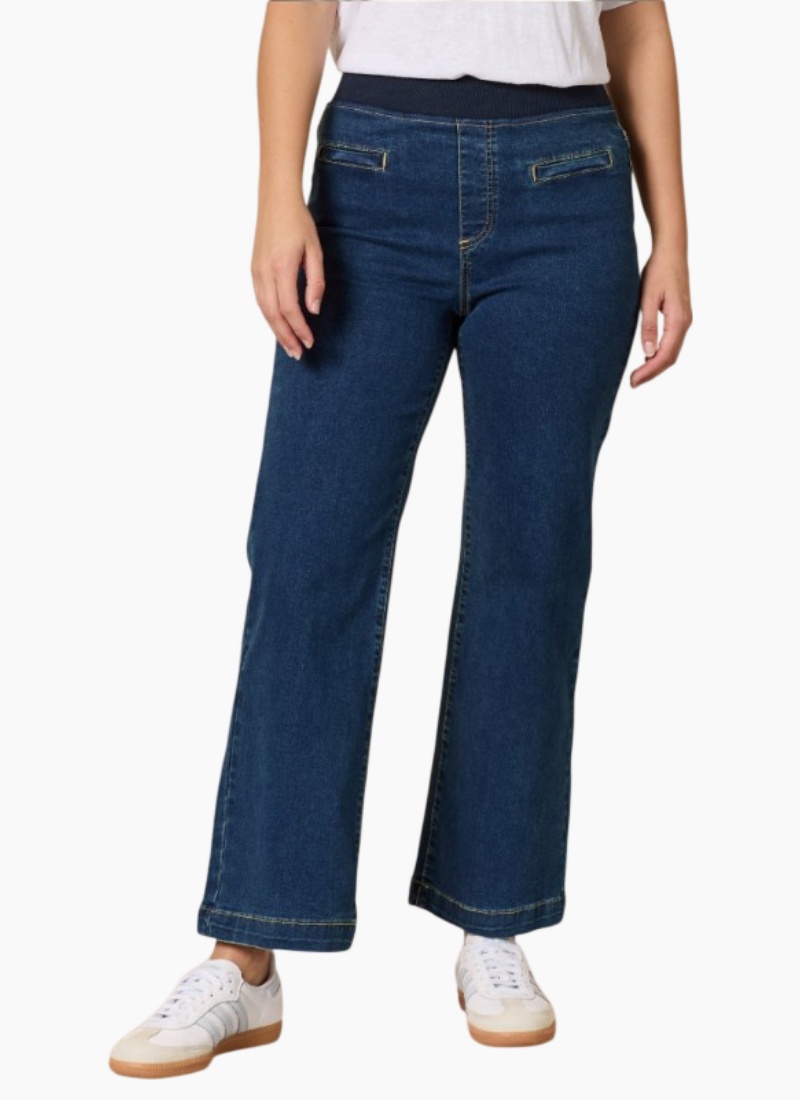 Introducing the Maddy Pull on Wide Leg Jean from Threadz. These dark blue denim jeans combine effortless comfort with a polished, contemporary silhouette.