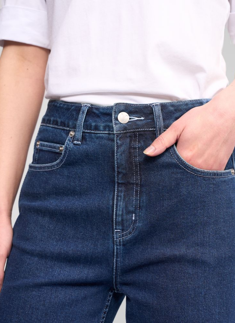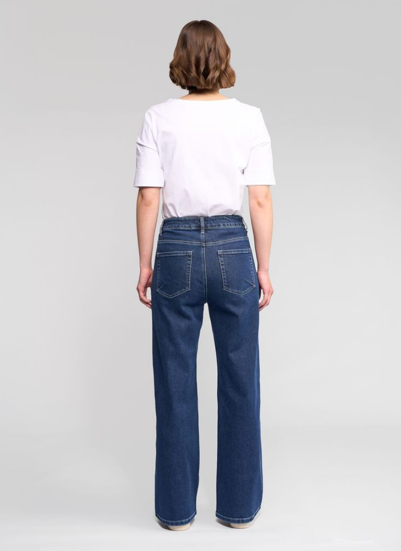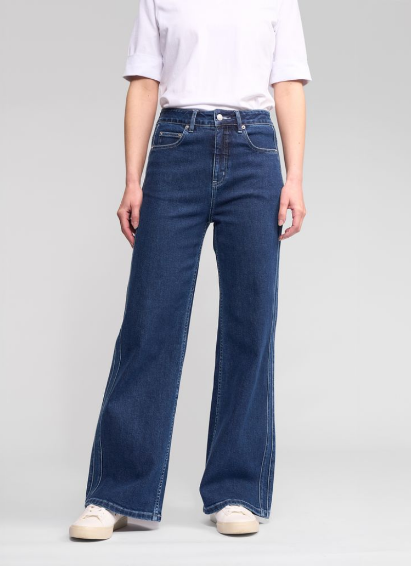Wide-leg full-length jean in dark blue, designed with double seam detailing on the sides. This clean, elongating detail enhances the silhouette, creating a flattering, modern jean that works easily for everyday wear.• Wide leg, full-length jean • Made from stretch denim for the perfect fit • Waistband features metal 'V' logo jean button closure, two front beltloops, and three back beltloops • Zip fly • Back patch pockets • 'Vassalli' embroidery above wearers right-hand back pocket • Double seam detail on side of legs • Model wears size 10 97% Cotton 3% Elastane