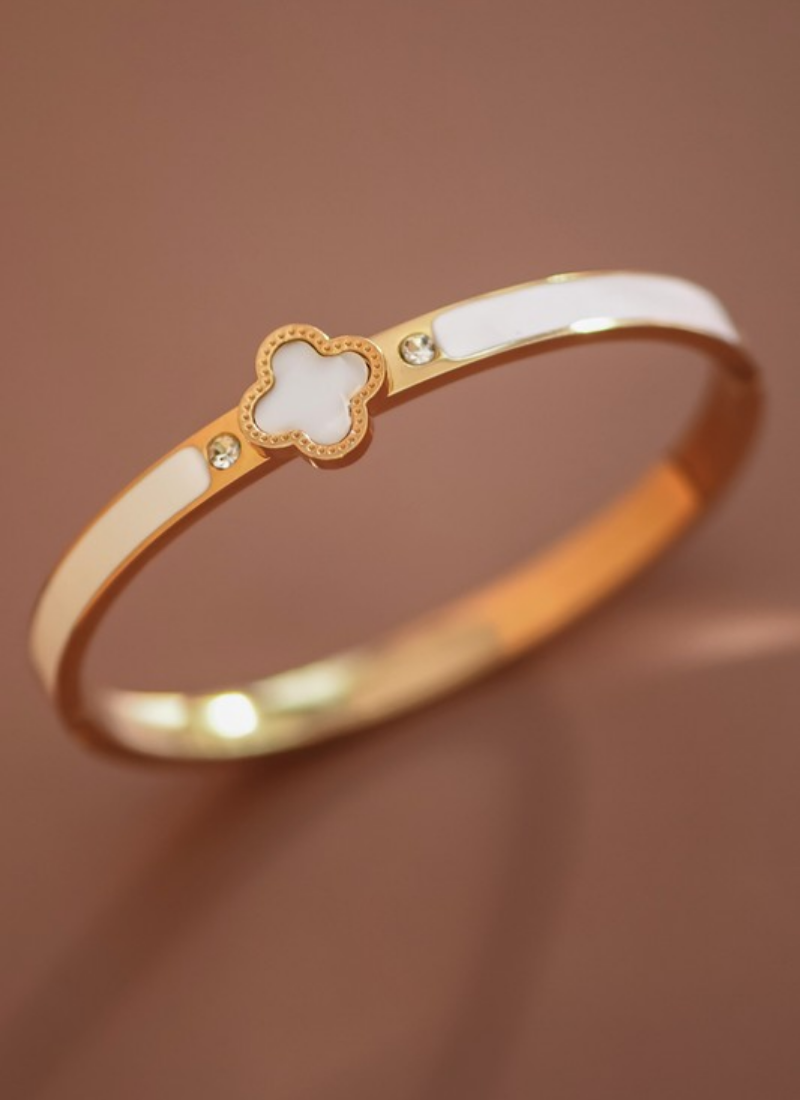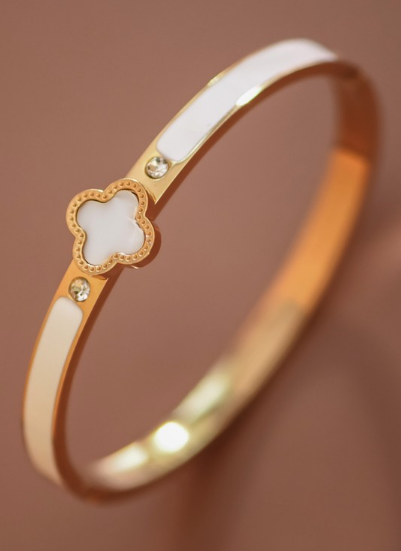 A four-leaf clover design bangle perfect for everyday wear or as a meaningful gift, also available in black