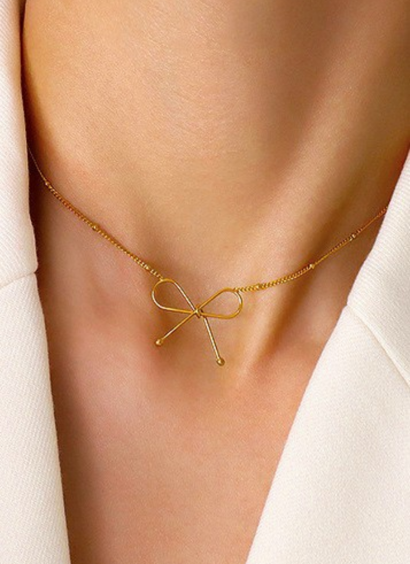 Add a sweet touch to your look with this adorable gold bow necklace.