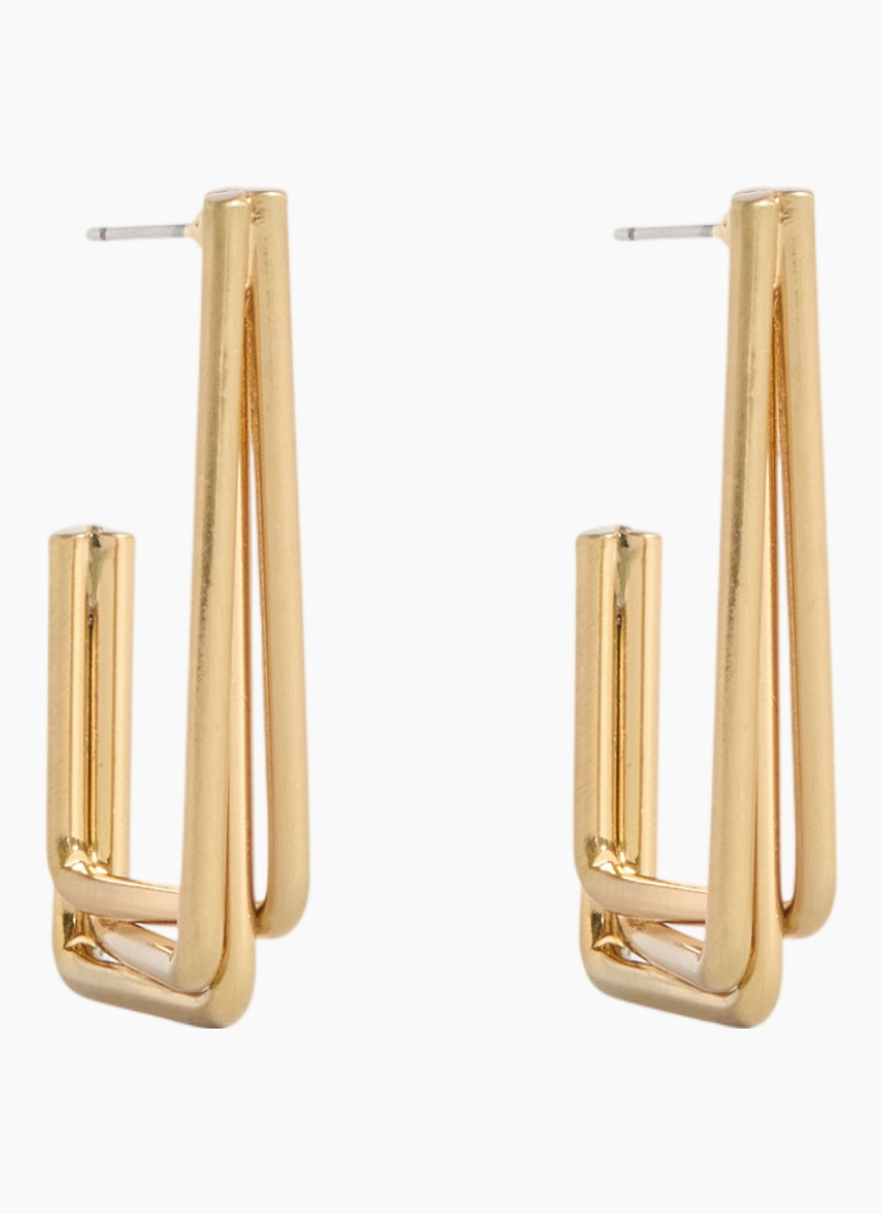 The Sokar Earrings are a unique take on our square opened-ended hoops, a sculptural mid-sized design in a brushed metal with a matte finish. The key feature of these earrings is the three-square hoop frames layered together in an organic, wabi-sabi fashion. This lightweight design is perfect for all day wear. These earrings add a subtle unexpected touch to day and evening outfits.Brushed metallic matte finish Three square frames layered together Stud back