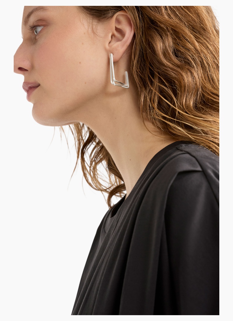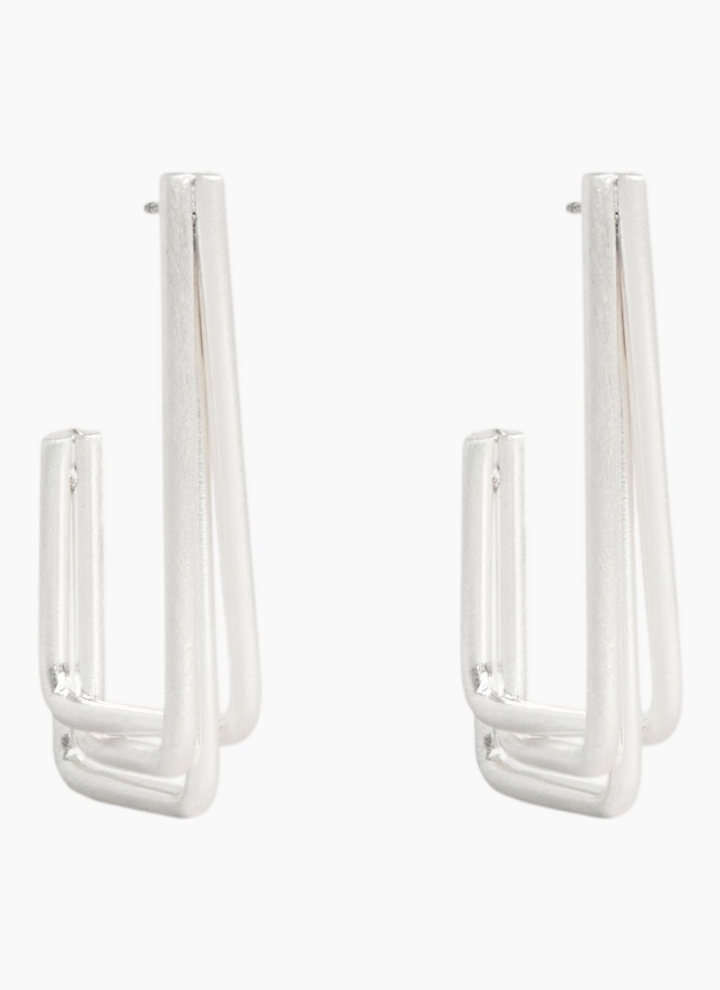 The Sokar Earrings are a unique take on our square opened-ended hoops, a sculptural mid-sized design in a brushed metal with a matte finish. The key feature of these earrings is the three-square hoop frames layered together in an organic, wabi-sabi fashion. This lightweight design is perfect for all day wear. These earrings add a subtle unexpected touch to day and evening outfits.Brushed metallic matte finish Three square frames layered together Stud back