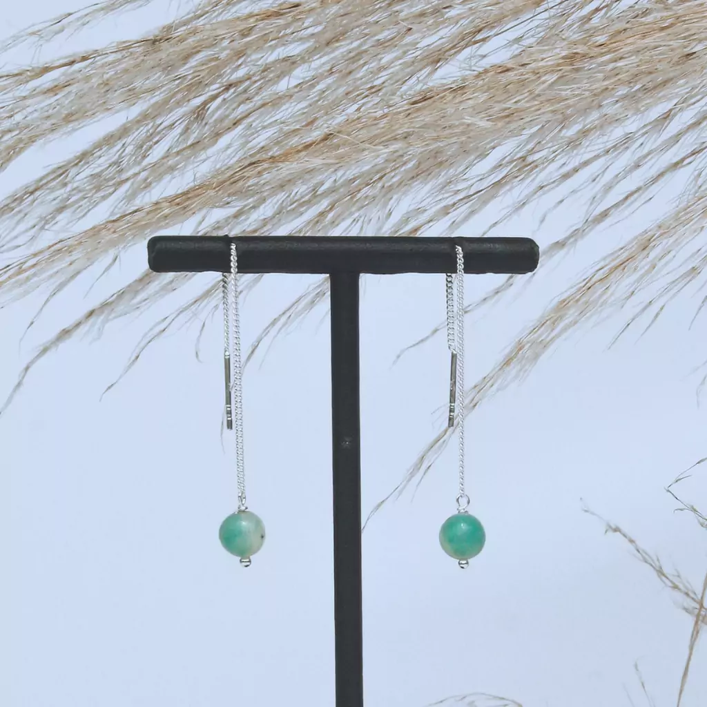 The beautiful, soft amazonite stone hangs at the end of the sterling silver thread earring. Each earring is threaded through your piercingk and can hang at your desired length. The amazonite is a refreshing precious stone, that is bright and turquoise in colour.