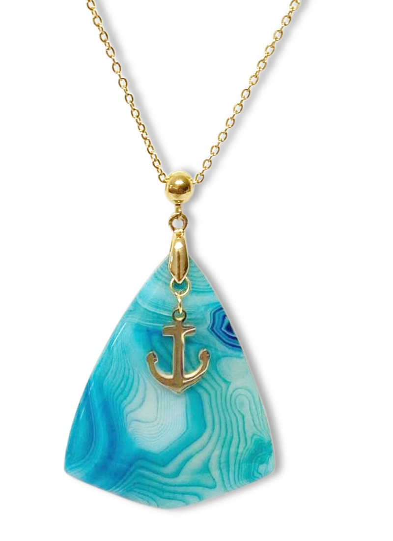 The bright and beautiful blue agate stone sits at the end of the gold coloured stainless steel chain. Paired with the gold chain and blue agate stone, is your choice of pendant. The blue agate stone has bands layers of blue, showing many hues. This is a long style of necklace, sitting on or below the bust. The total chain length is 85cm, with a 5cm extender. Due to each stone being natural, there will be some variation in the shape and colour of each stone.