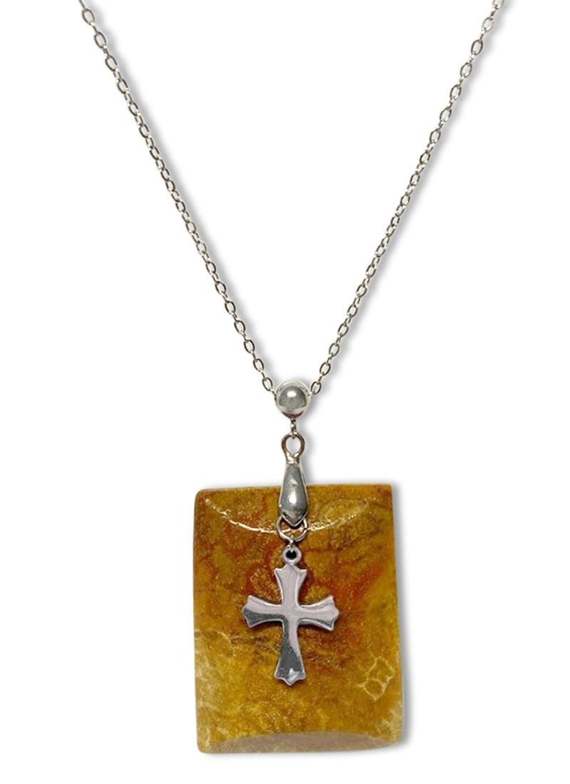 The unique honey coral stone sits at the end of the silver coloured stainless steel chain. Paired with the silver chain and honey stone, is your choice of pendant. The tones and shades of honey, yellow, and mustard, as well as the natural coral style features, are simply incredible. This is a long style of necklace, sitting on or below the bust. The total chain length is 85cm, with a 5cm extender. Due to each stone being natural, there will be some variation in the shape and colour of each stone.