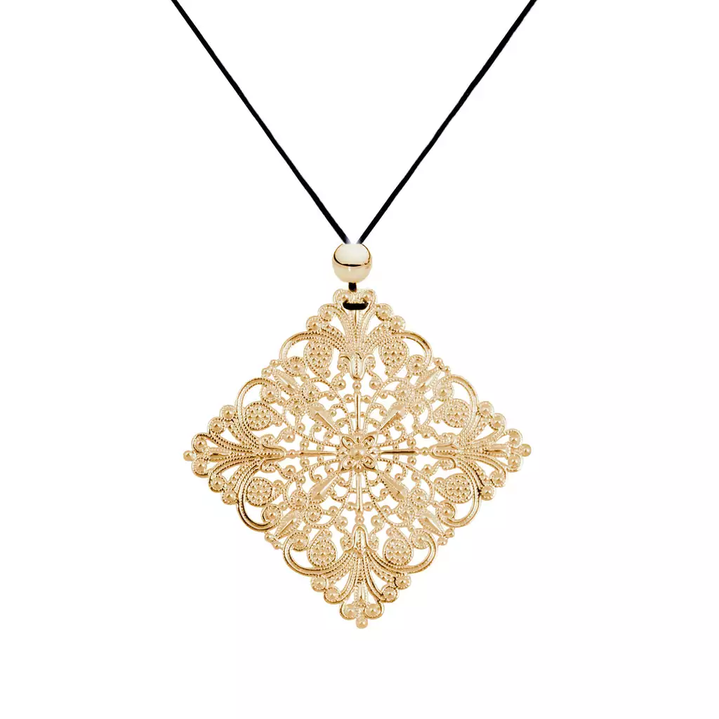 The lacey diamond yellow gold necklace, is light weight, adjustable and perfect for everyday wear. To adjust the pendant to sit at your desired length, simply slide the bead along the black cord. The cord is 75cm long so the necklace can be worn short, or long. The yellow gold diamond pendant and necklace style is modern and very on trend. Pair this necklace with the lacey yellow gold diamond earrings.