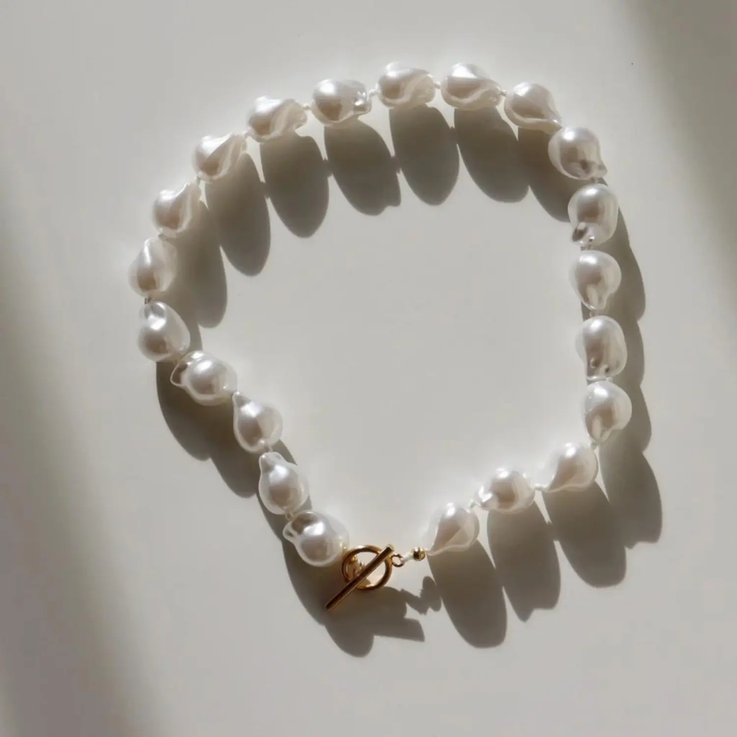 Designed to be a very modern, on-trend necklace the baroque style pearls have been placed on double knotted cotton for extra durability. The short style pearl strand has been paired perfectly with the fob style finish. The metal is stainless steel, complete with 14kt yellow gold plating. The length of the strand is 40cm.