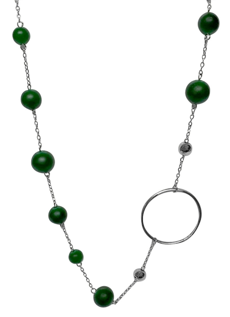 Stainless steel and green glass combine to make this unique necklace. This long style necklace sits on the bust. The chain and silver balls are made of stainless steel, while the green balls are glass. The long necklace is 85cm.