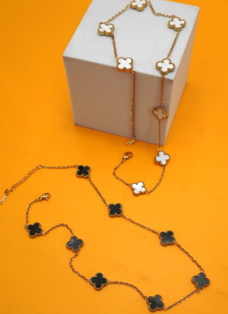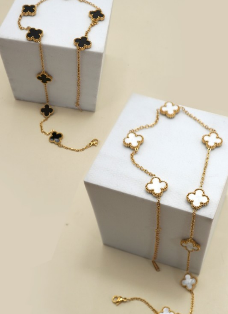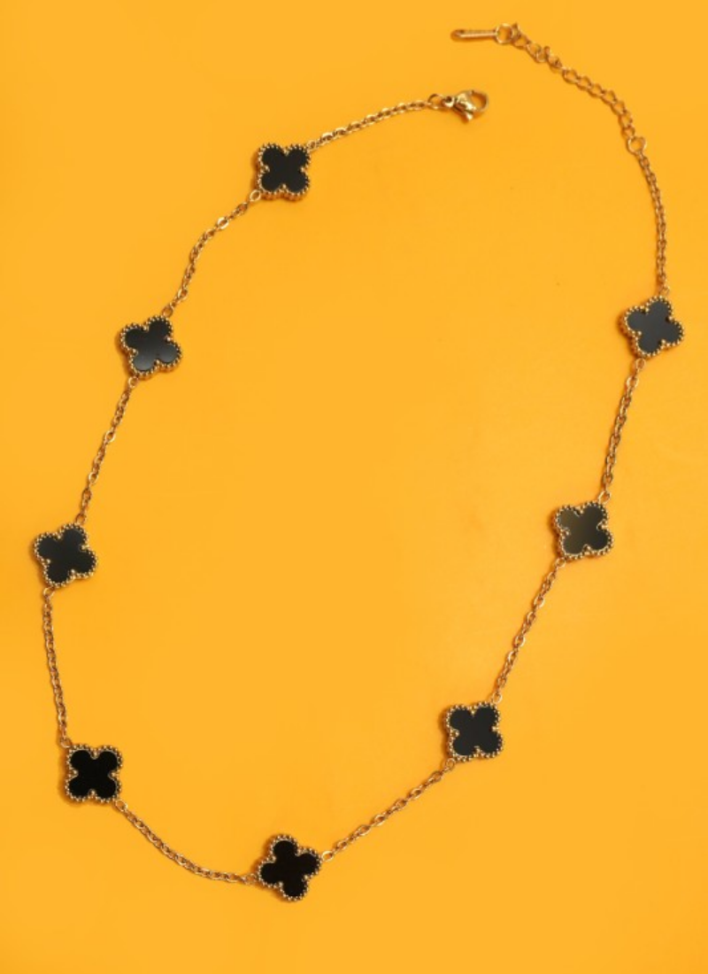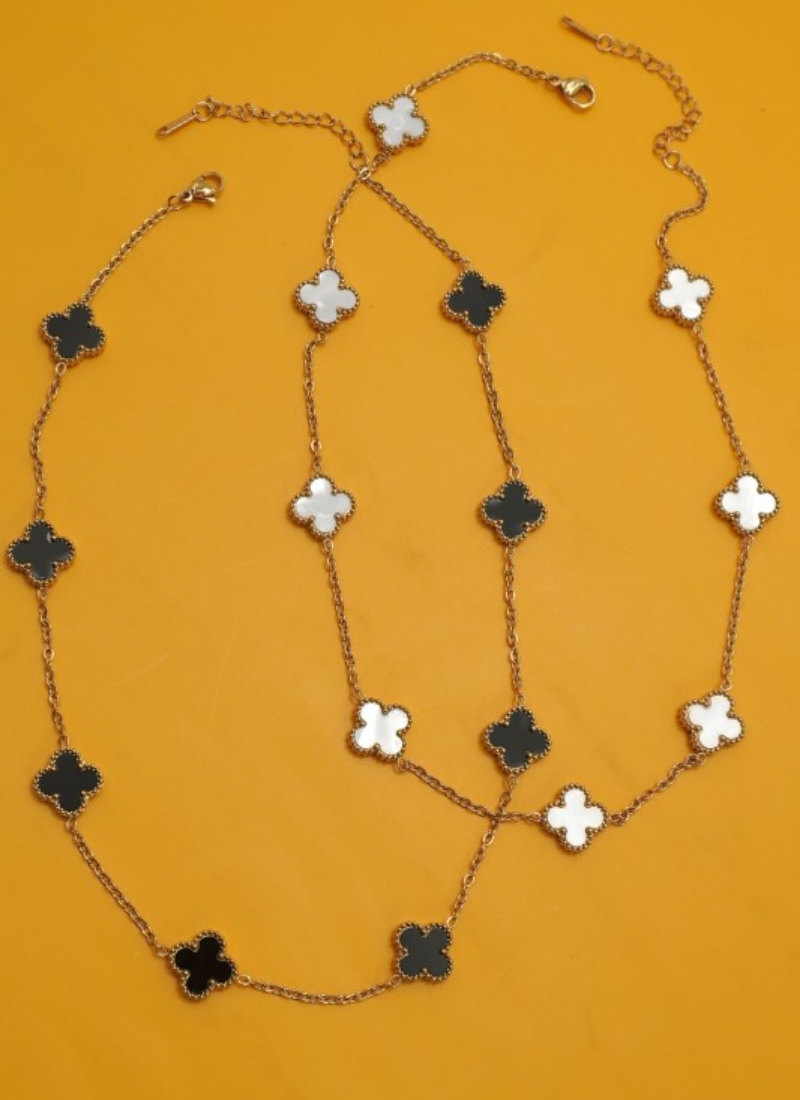 This plated stainless steel clover necklace is a timeless and elegant piece featuring delicate clover stations on a sleek chain.
