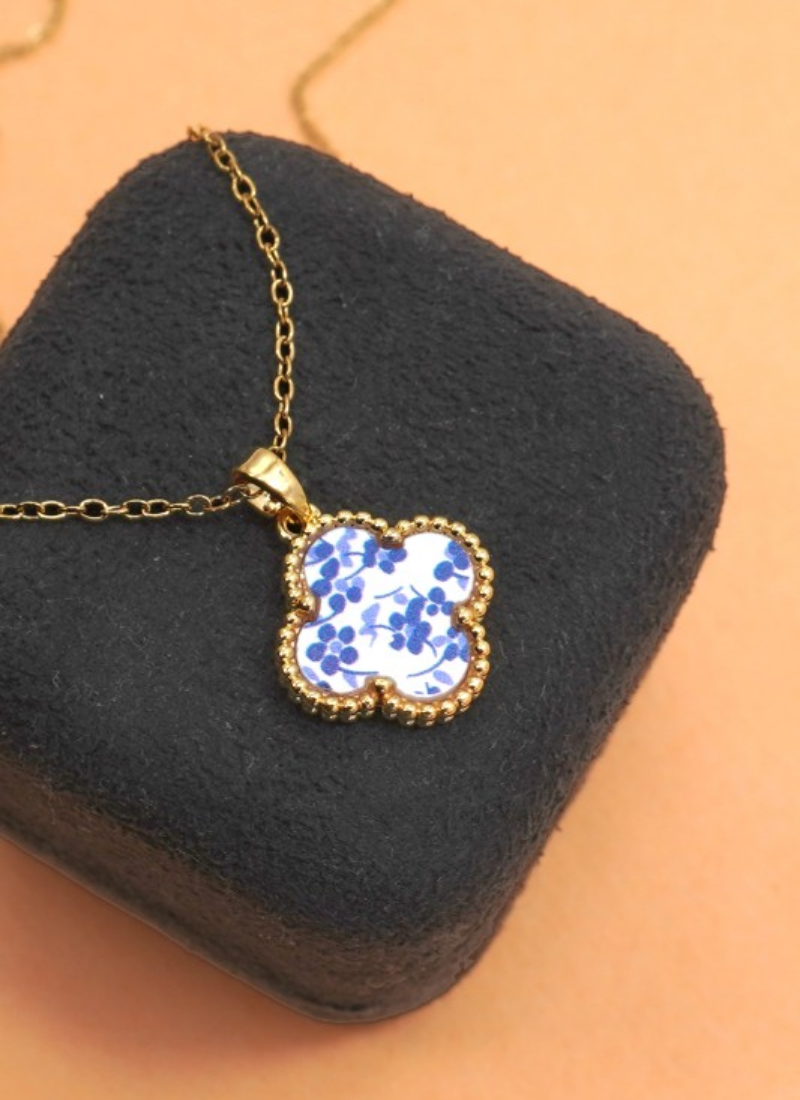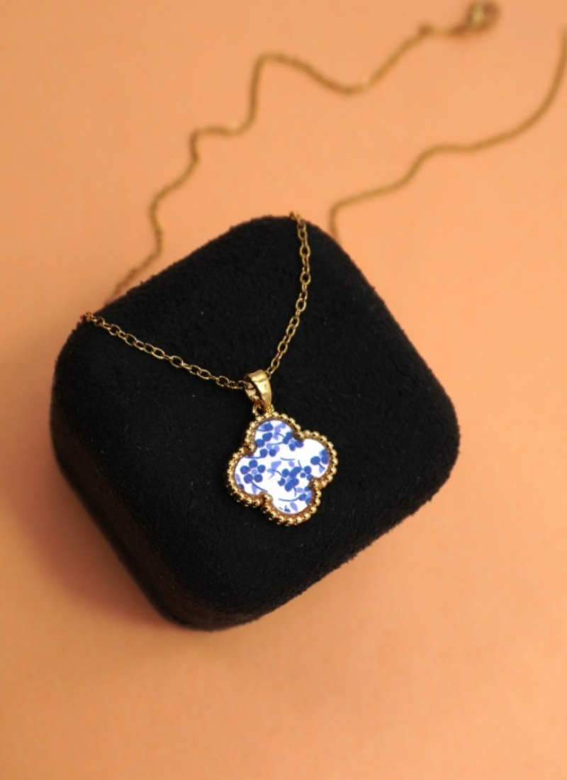 Clover pendant necklace with porcelain floral inset.