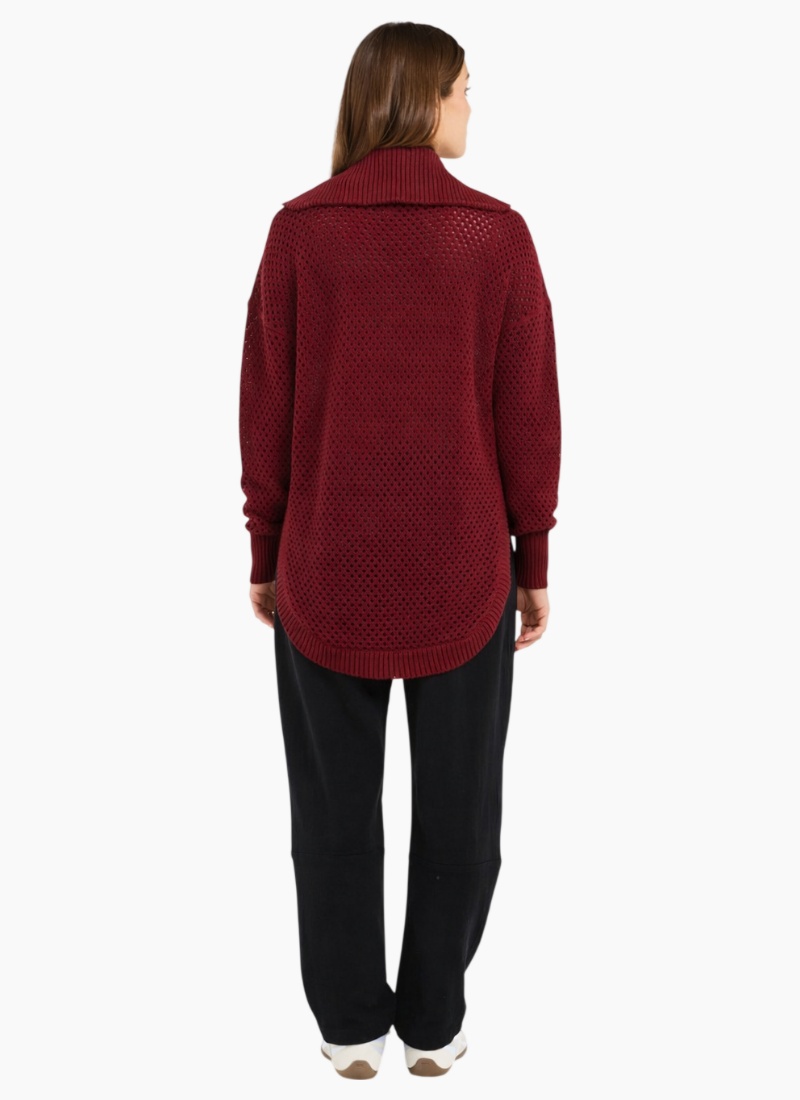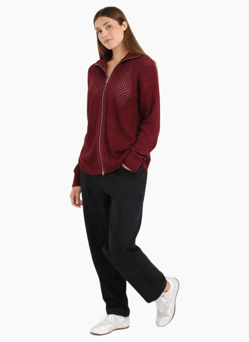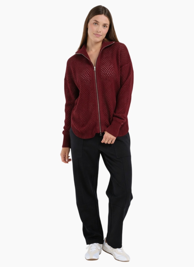 Introducing the Lexington Scoop-Port from Blackstone. A relaxed, zip-front burgundy cardigan cut in an openwork knit for lightweight, wearable texture.