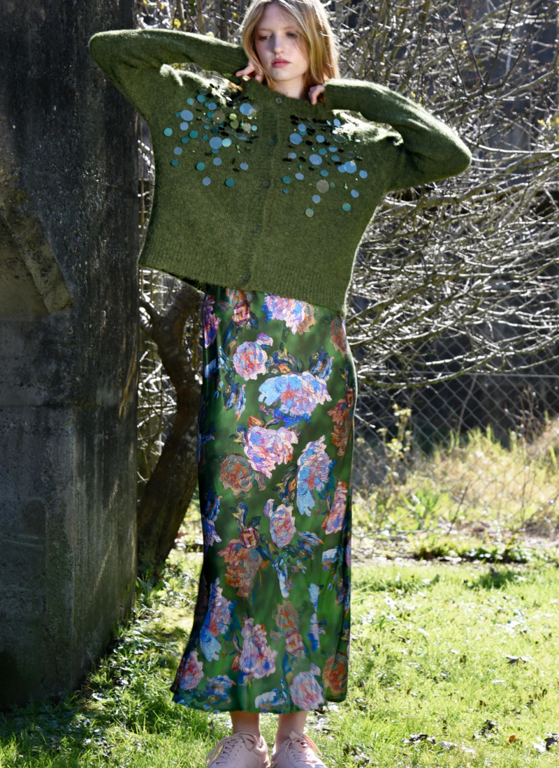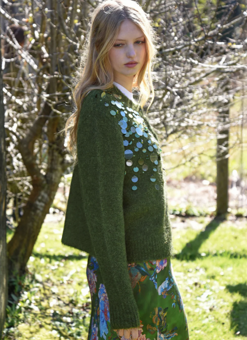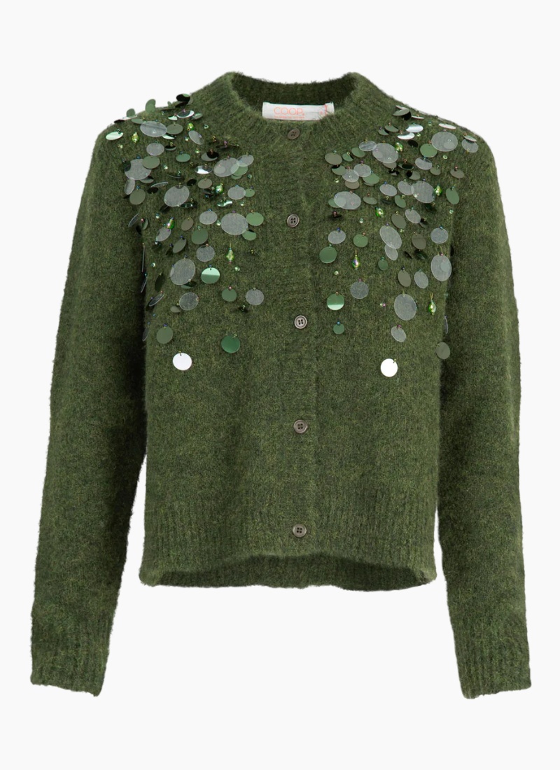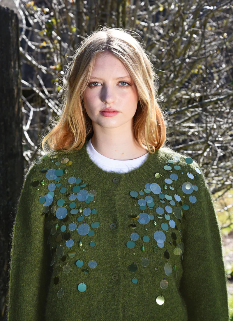 Introducing the Cardi-Bling Cardigan - Shinny Side Up Green from COOP. This statement cardigan pairs a soft mohair texture with bold sequinned detail for a playful, elevated finish.