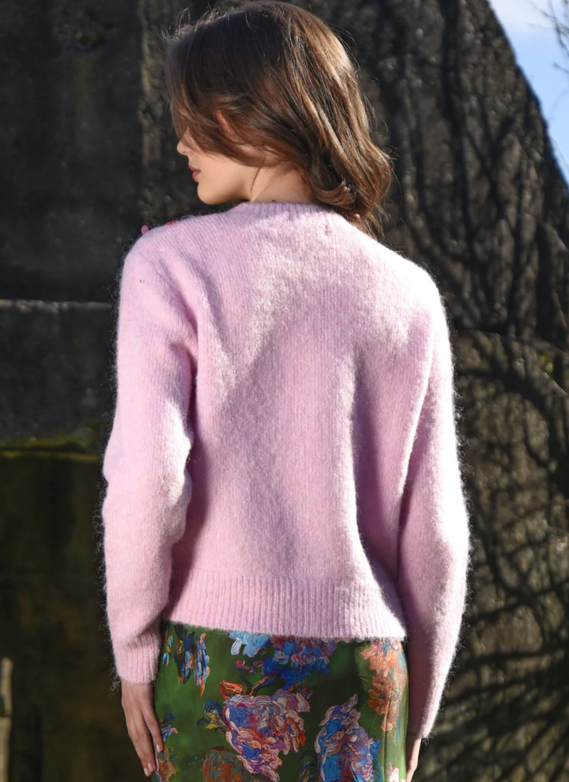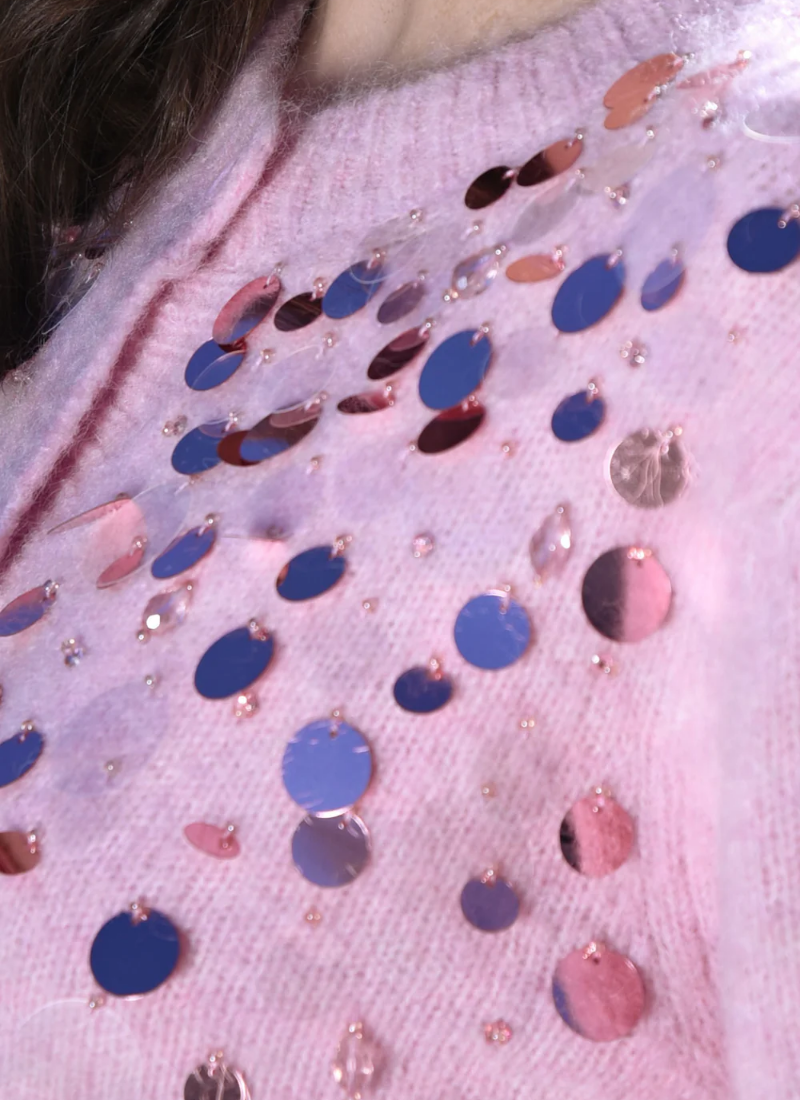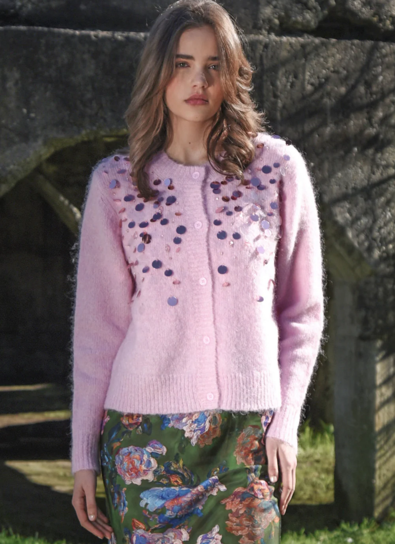 - Button-front cardigan in a pastel pink colour with scattered sequins for subtle sparkle