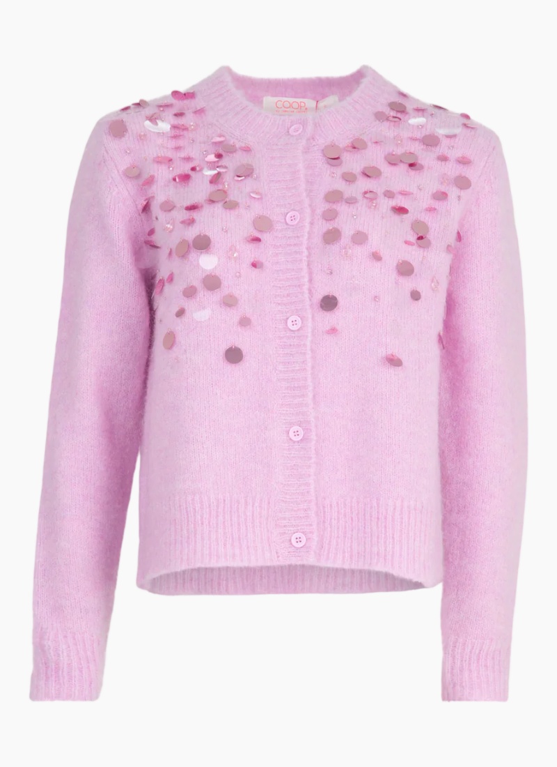 Introducing the Cardi-Bling - Shinny Side Up Pink from COOP. This playful cardigan pairs a soft, fuzzy texture with shimmering sequin detail for an elegant yet fun finish.