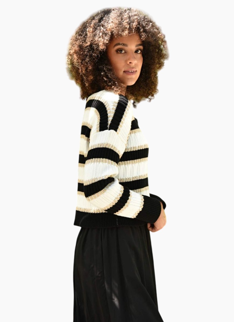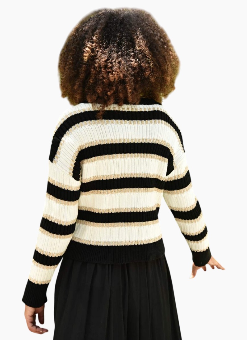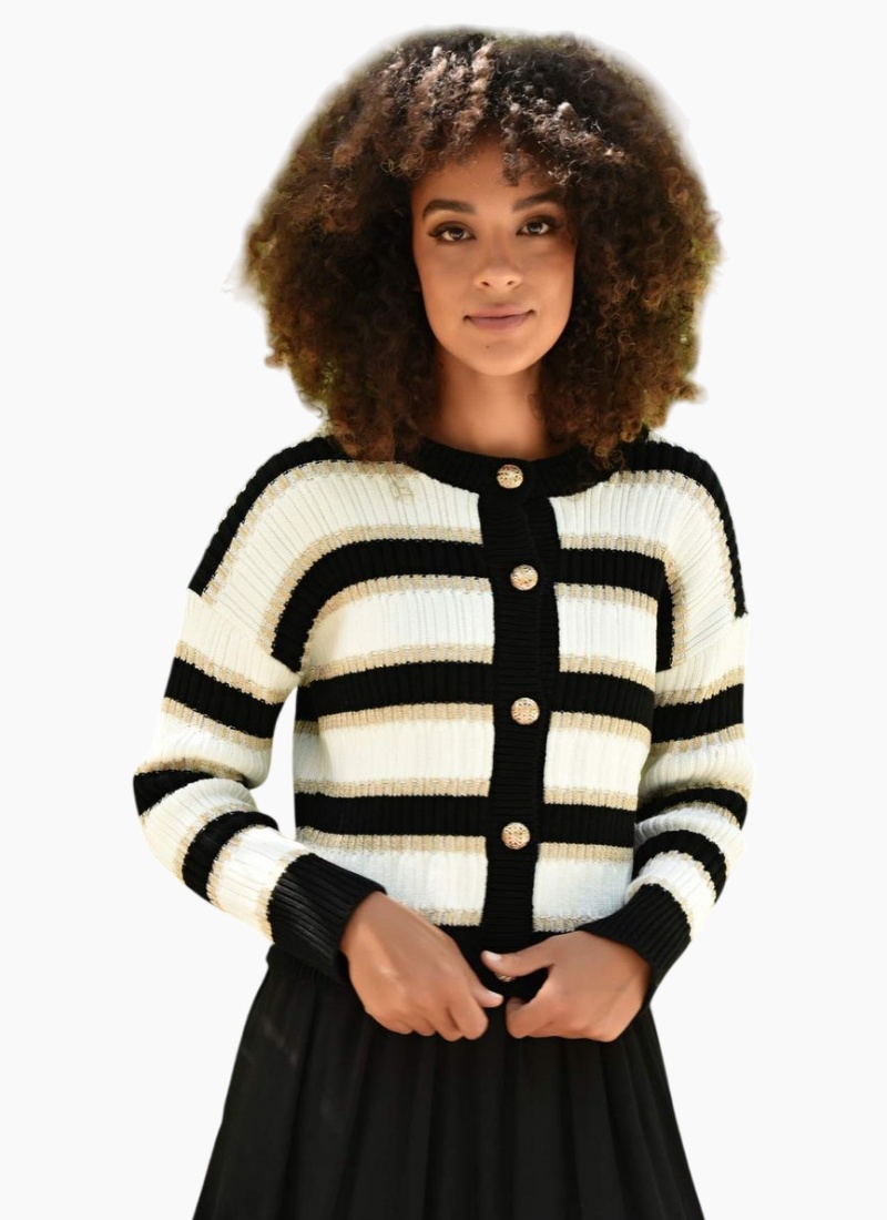 Classic with a playful twist, the ‘Going for Gold’ cardigan is expertly balanced. Crafted in the ‘Stripe Dreams’ knit, this cardigan sports a classic fit with an added drop shoulder and lurex stripe for a modern touch. Choose to juxtapose this preppy piece with casual jeans or go all out with the ‘Midas Touch’ dress for a fun twin set.• Button through • Drop shoulder • Lurex stripe • Metal gold-toned buttons