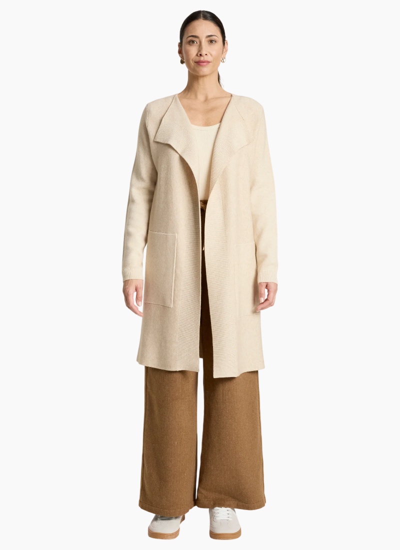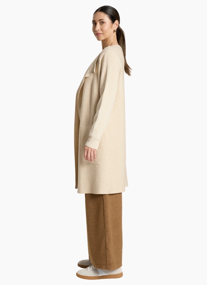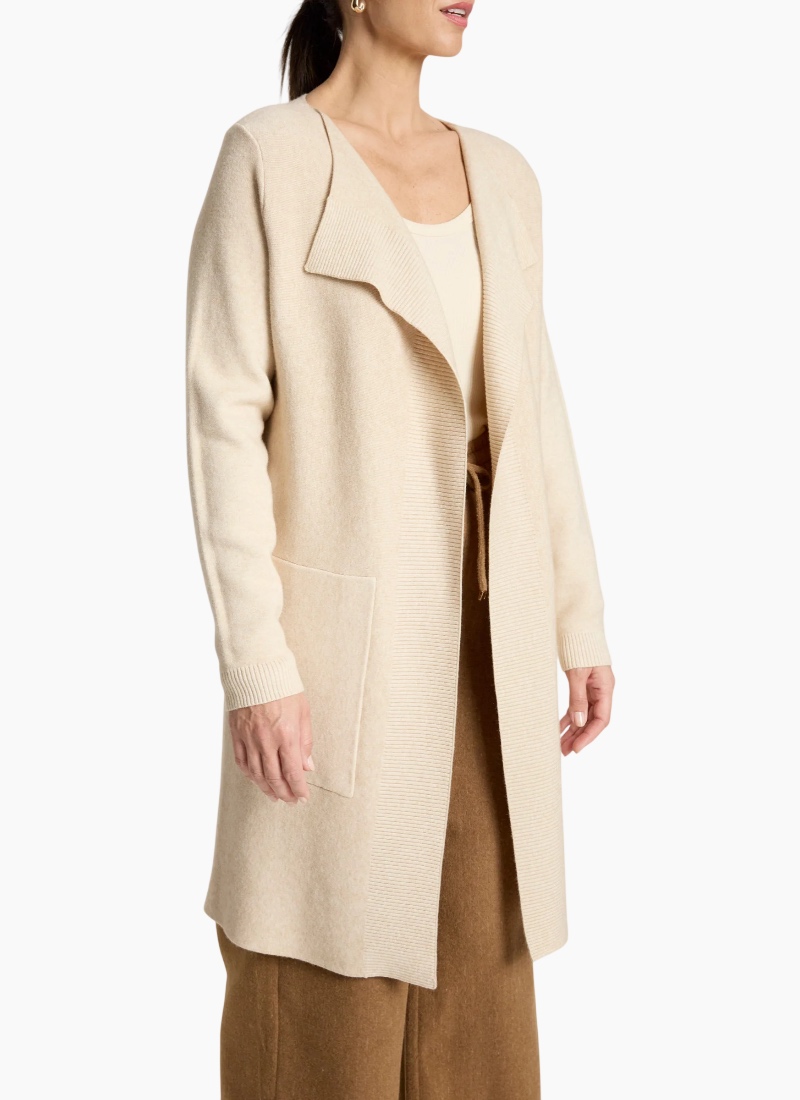 A polished knit cardigan designed for refined everyday wear. Featuring a slimline silhouette with ribbed detailing running from the lapel and functional side pockets, this style offers warmth with a clean, flattering finish. Features Slimline cardigan silhouette Ribbed detailing from lapel Side pockets Soft knit blend Flattering, streamlined fit Care Cold gentle wash recommended.