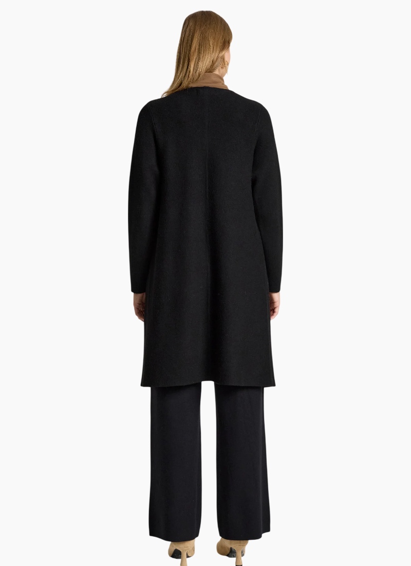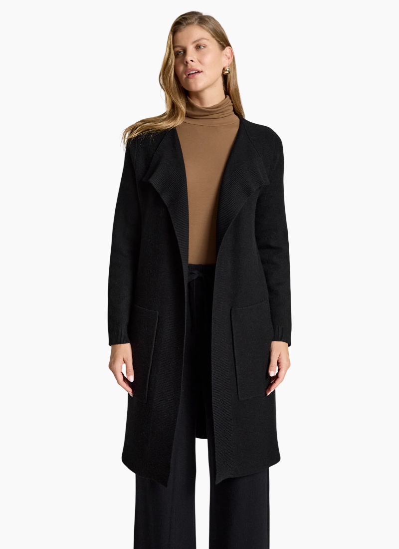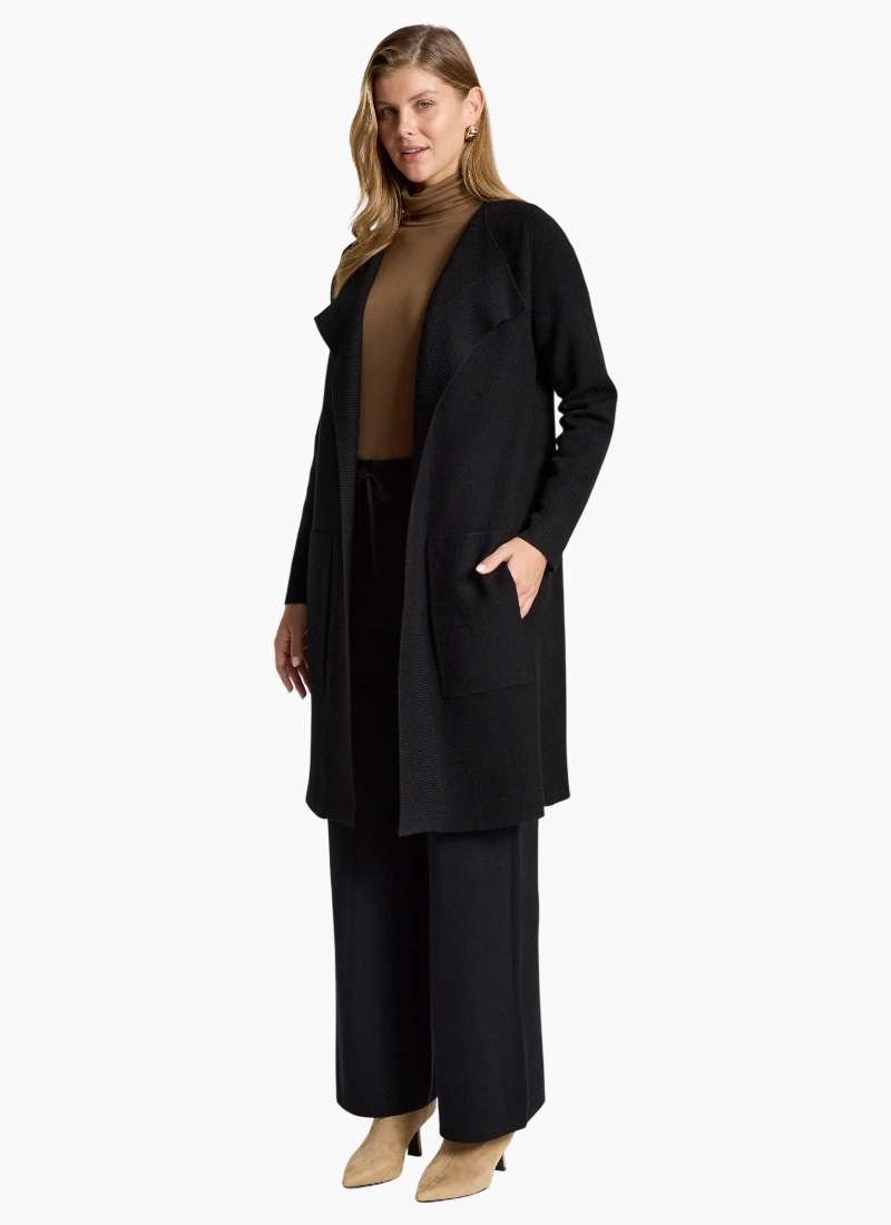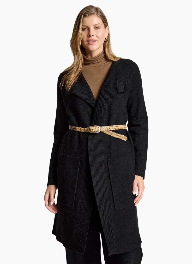 A polished knit cardigan designed for refined everyday wear. Featuring a slimline silhouette with ribbed detailing running from the lapel and functional side pockets, this style offers warmth with a clean, flattering finish. Features Slimline cardigan silhouette Ribbed detailing from lapel Side pockets Soft knit blend Flattering, streamlined fit Care Cold gentle wash recommended.