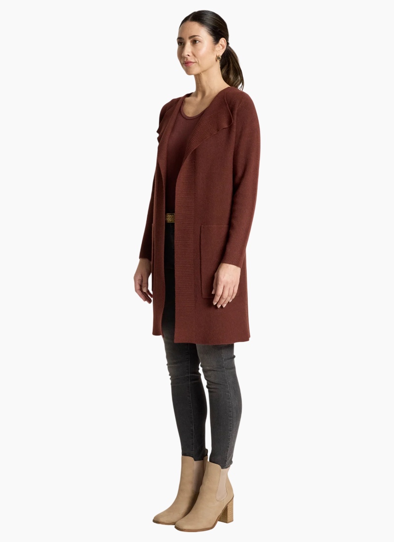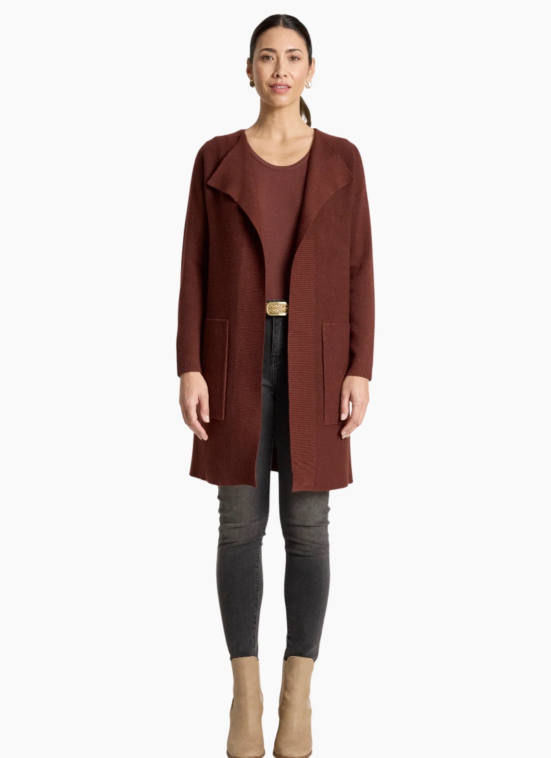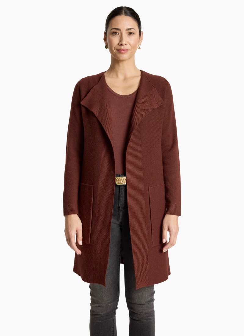 A polished knit cardigan designed for refined everyday wear. Featuring a slimline silhouette with ribbed detailing running from the lapel and functional side pockets, this style offers warmth with a clean, flattering finish. Features Slimline cardigan silhouette Ribbed detailing from lapel Side pockets Soft knit blend Flattering, streamlined fit Care Cold gentle wash recommended.