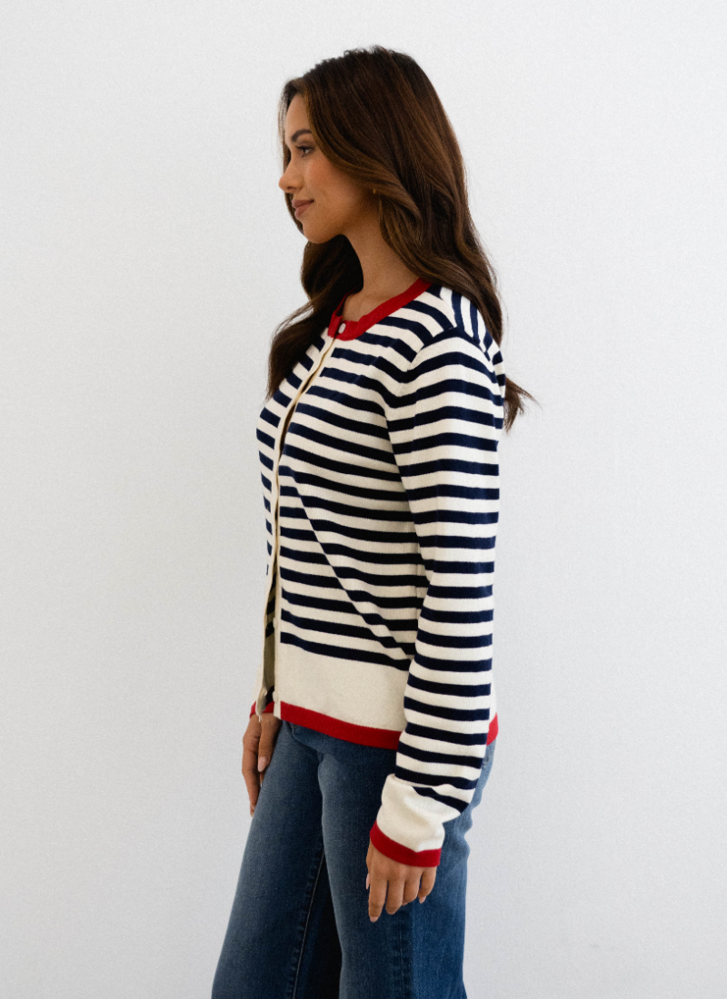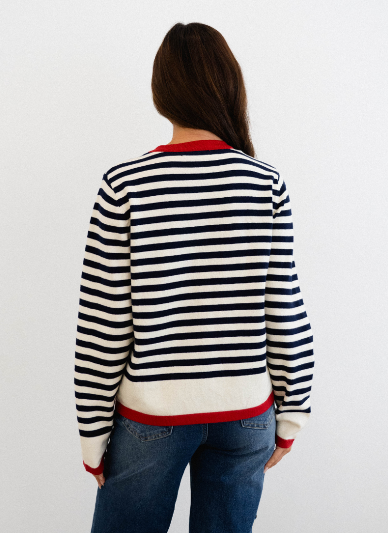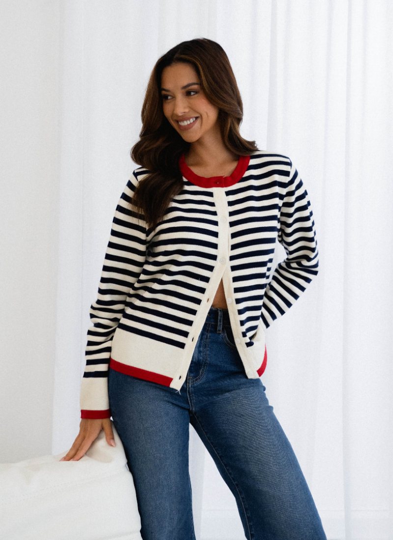 Introducing the Siane Cardi NAVY STRIPE from Label of Love. This charming striped cardigan brings a fresh, nautical-inspired touch to your knitwear collection.
