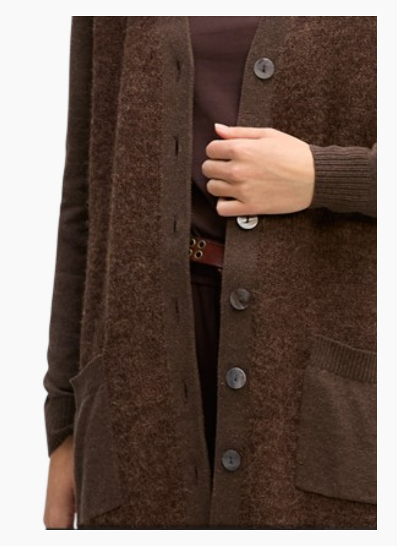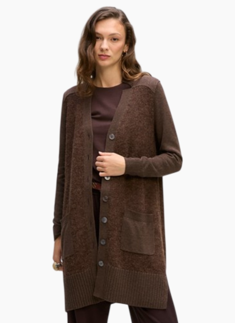 Introducing the Fluffy Detail Cardi Cocoa from LD & Co. This longline cardigan offers soft, cosy layering with refined, textural detailing for everyday elegance.