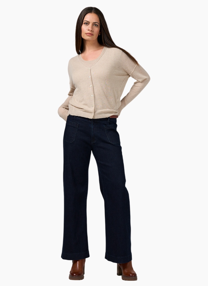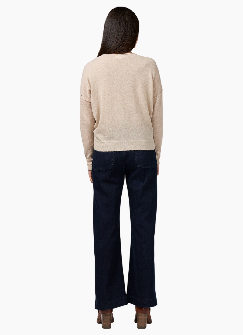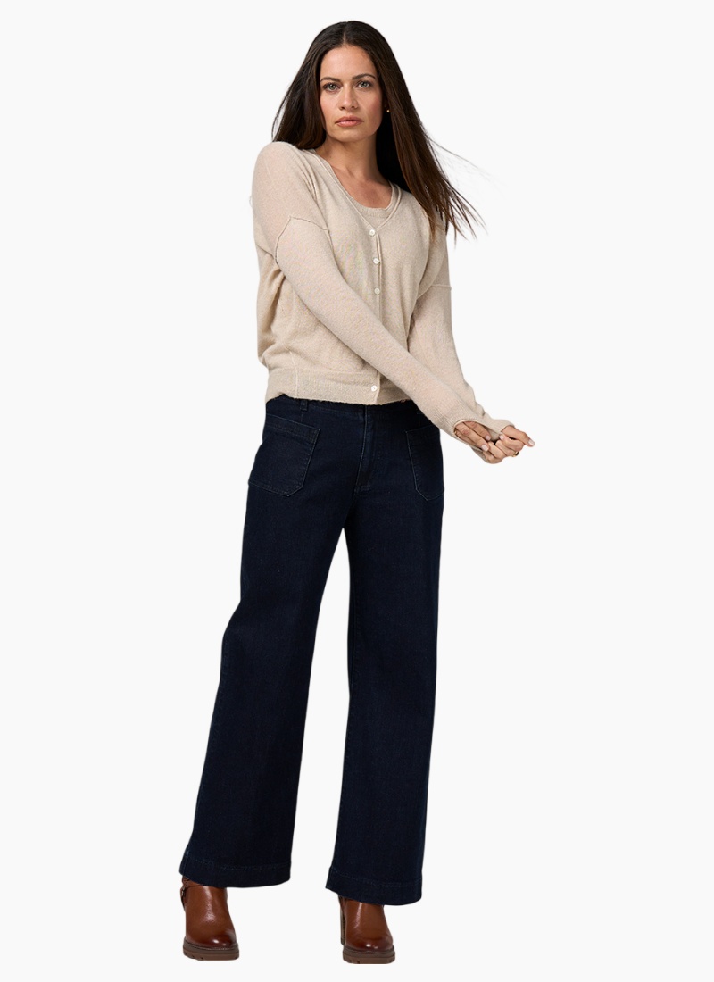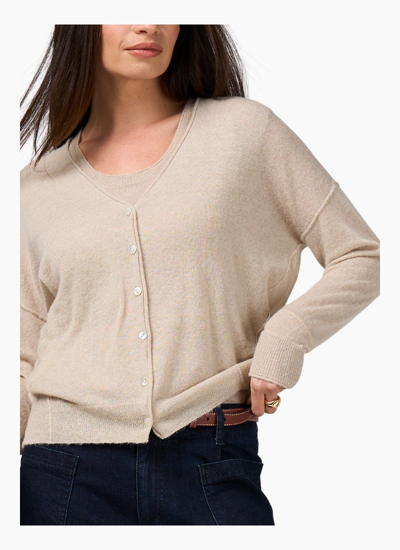 Lightweight cardigan in a wool blend with metallic yarn, featuring a modern batwing style with a cinched waist for a flattering silhouette.