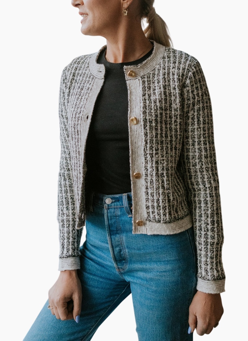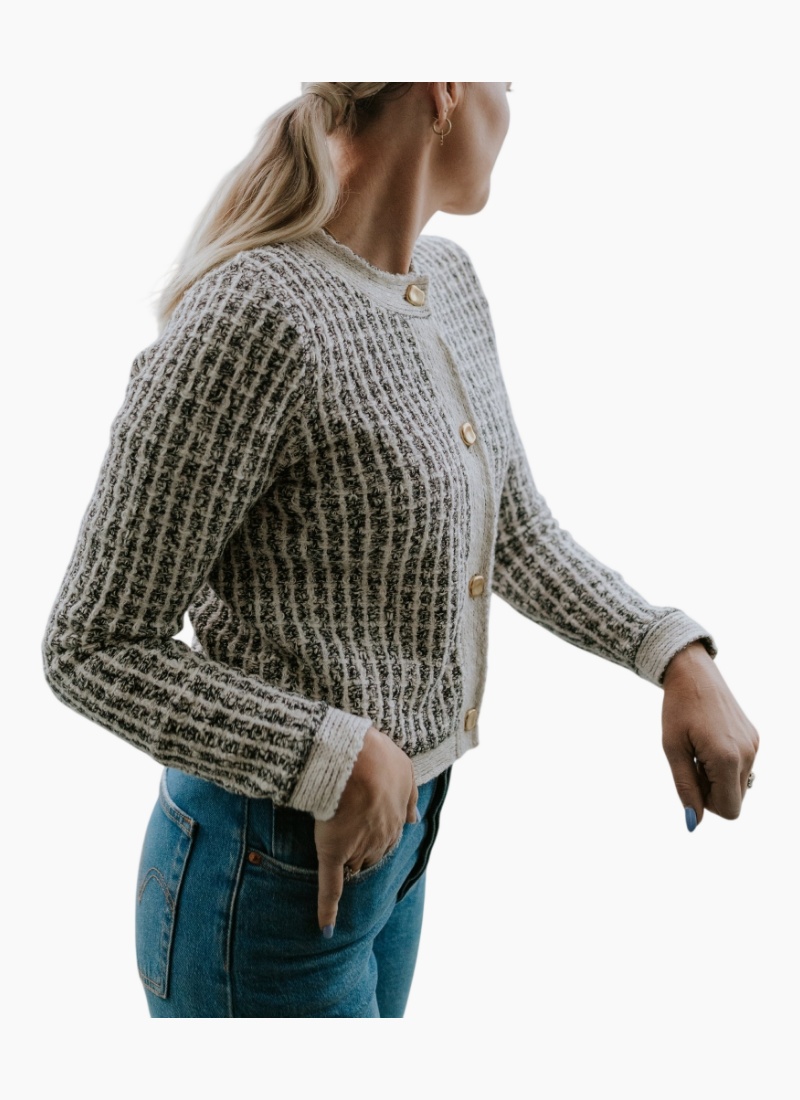 Elevated, versatile, and effortlessly stylish, the Vivian Cardigan is a fashion-forward knit designed to move seamlessly between seasons and occasions. Crafted from a cotton-blend novelty knit, Vivian delivers texture, warmth, and structure with a refined, modern feel. Designed with a classic crew neckline and a heavier-weight construction, this women’s cardigan offers the perfect balance of comfort and polish. The substantial knit allows Vivian to be worn as a stylish outer layer on milder winter days or as a cosy sweater layered under coats when temperatures drop. Elegant gold-finished, vintage-style flat buttons run down the centre front, adding a timeless, elevated detail that sets this piece apart. Whether styled with tailored pants for a dressed-up look or worn casually with denim, Vivian is a versatile winter staple designed to work across your wardrobe. Sophisticated yet wearable, the Vivian Cardigan is the kind of knit you’ll reach for again and again, a refined essential for everyday winter dressing across New Zealand and Australia. Designed in New Zealand. Made for women living life across New Zealand and Australia. Women’s cotton-blend knit cardigan with a fashion-forward silhouette Novelty knit fabrication for texture and visual interest Heavier-weight construction for warmth and versatile wear Classic crew neckline for timeless styling Gold-finished vintage-style flat buttons at centre front Can be worn as a cardigan or styled as a cosy sweater Easy to dress up or down for a range of occasions