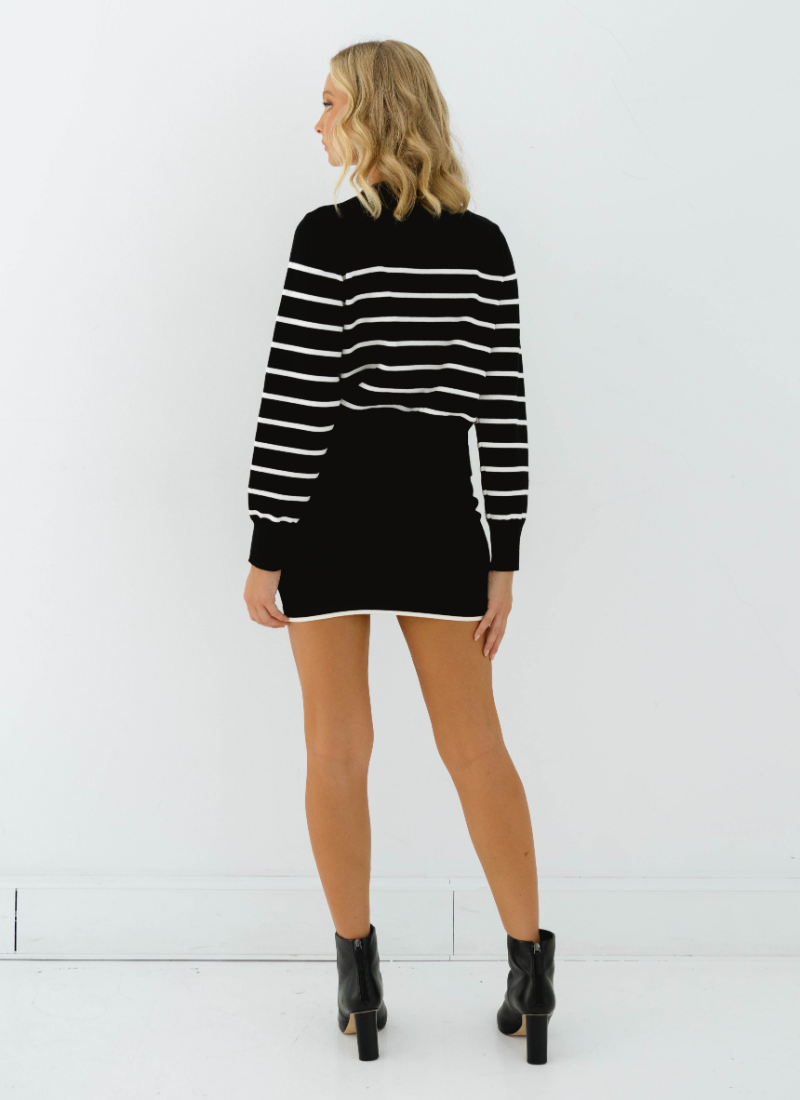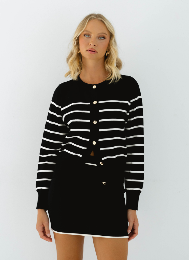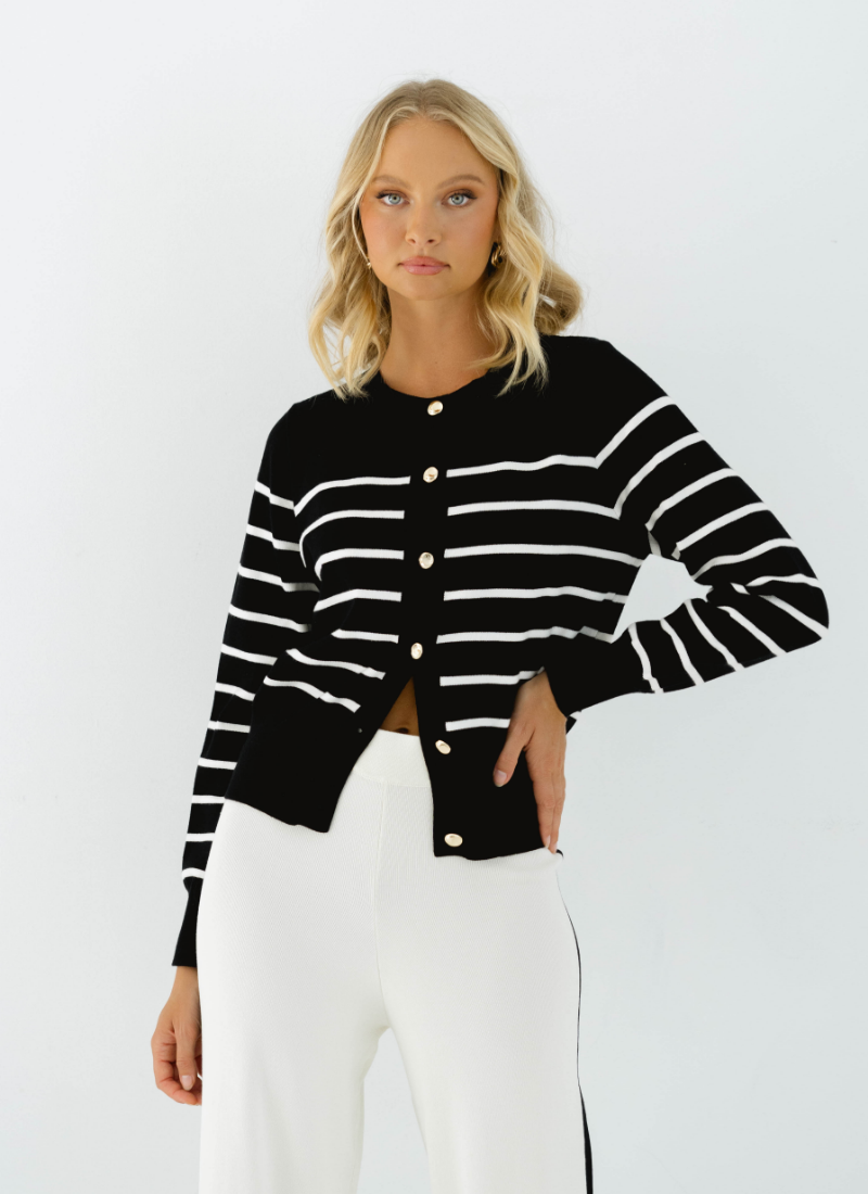 Introducing the Stripe Cardi from Paper Heart. This timeless piece brings graphic stripes and easy layering to your wardrobe.