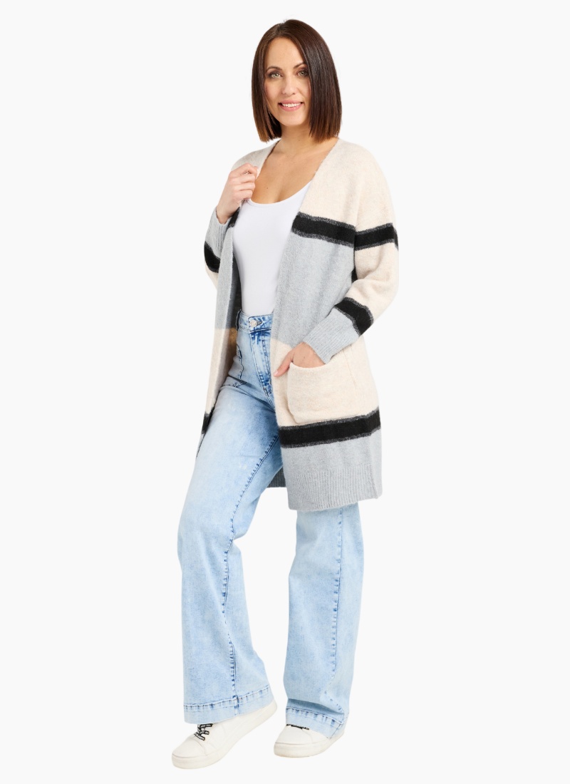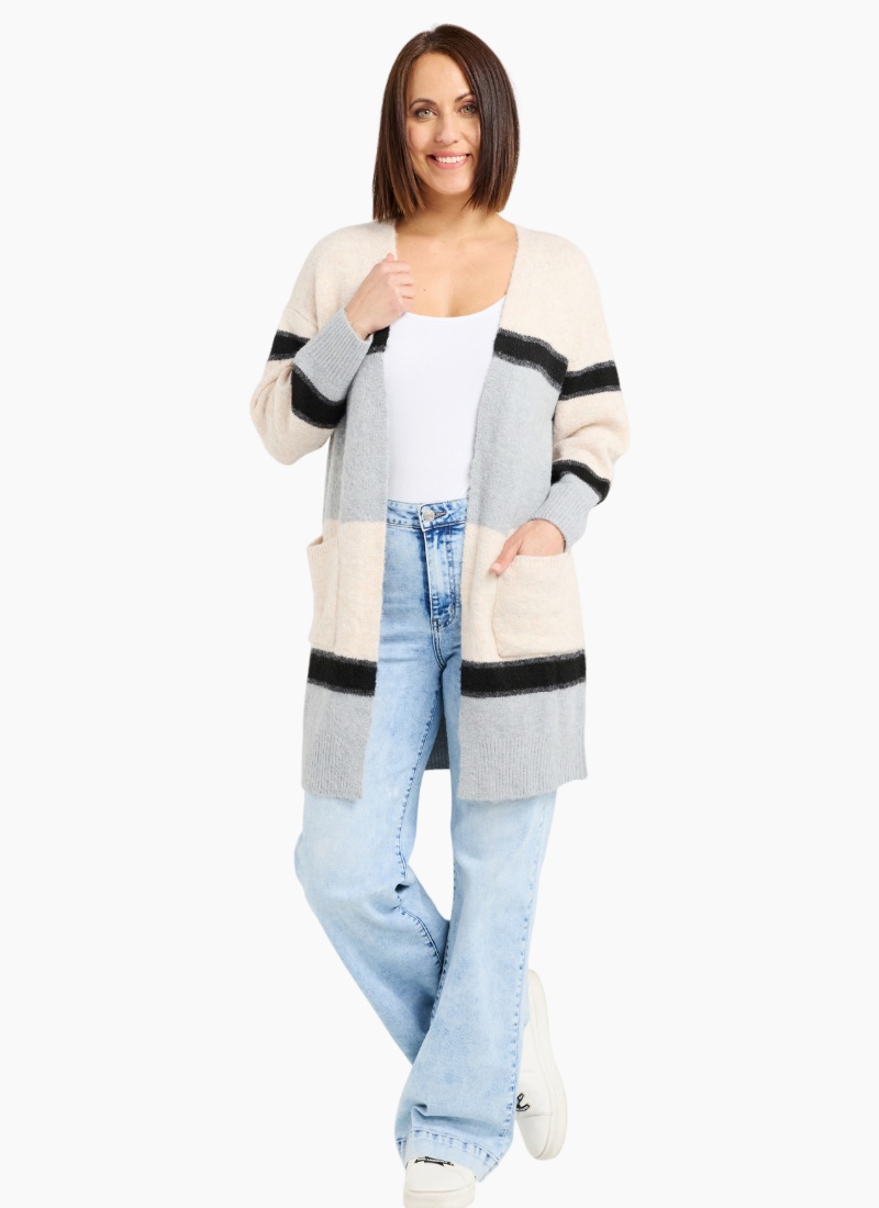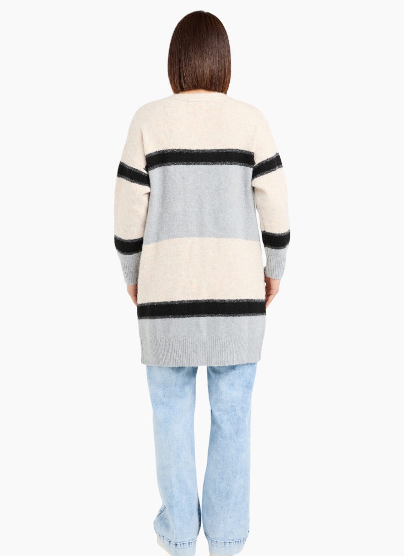 This long cardigan features a timeless striped pattern and an open-front design for effortless style. Lightweight yet cozy, it adds easy warmth and a relaxed, polished touch to any outfit. 57% Viscose 26% Acrylic 14% Nylon 3% Spx