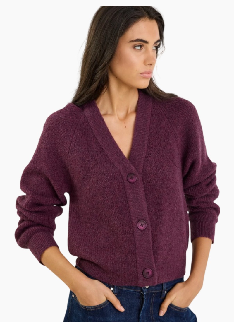The Essence Plum Cardigan is the cosy layer your wardrobe has been waiting for. With its softly textured knit, gentle puff sleeves and rich plum hue, it wraps you in warmth while still feeling polished and refined. The button front adds versatility, making it perfect for layering or wearing on its own for an effortlessly put together look. Style it buttoned up with denim or drape it over a slip dress to balance softness with modern edge.