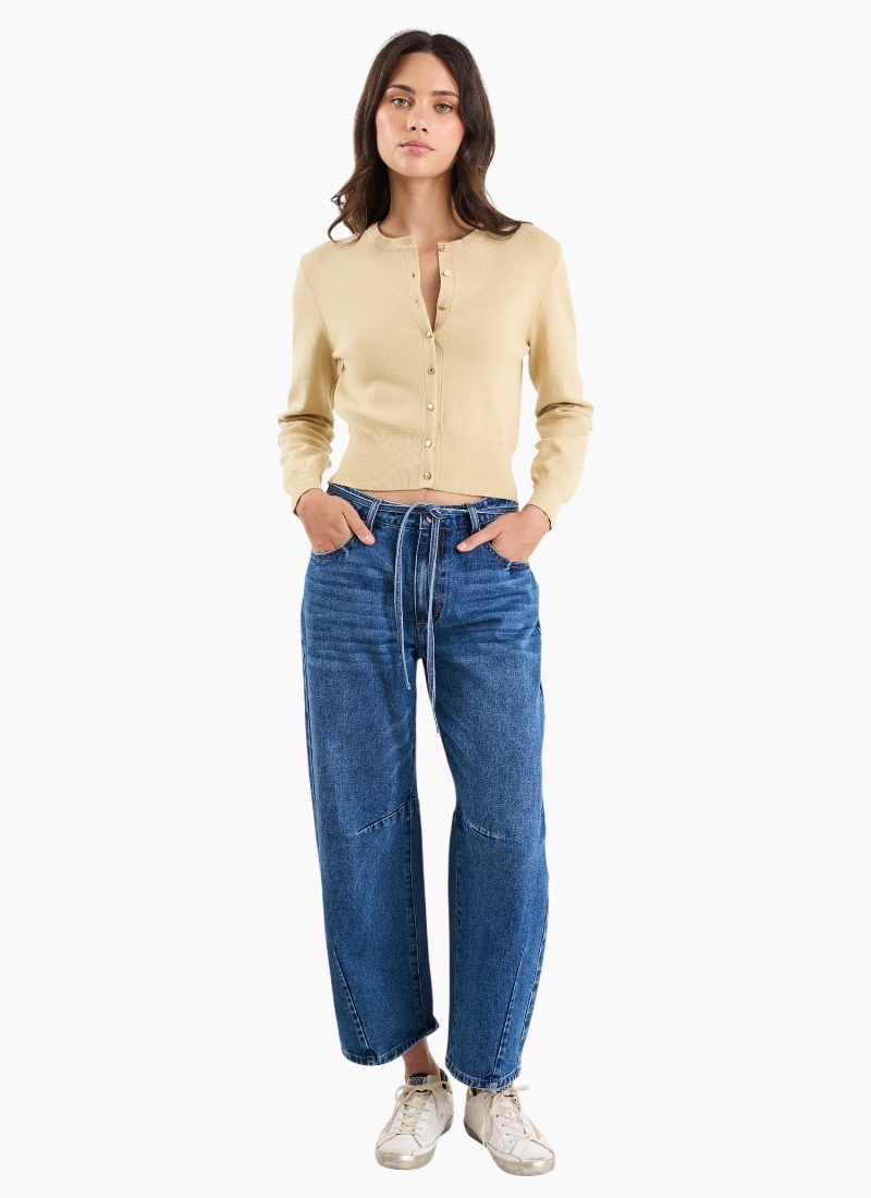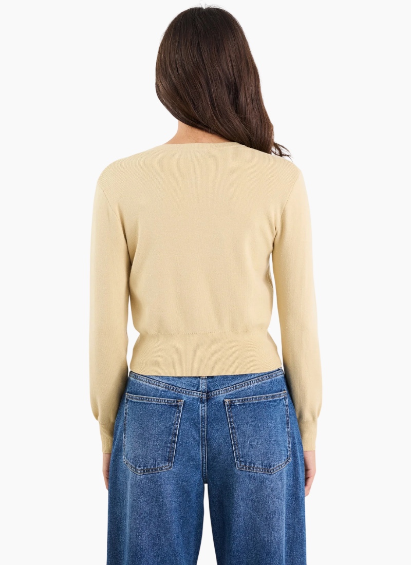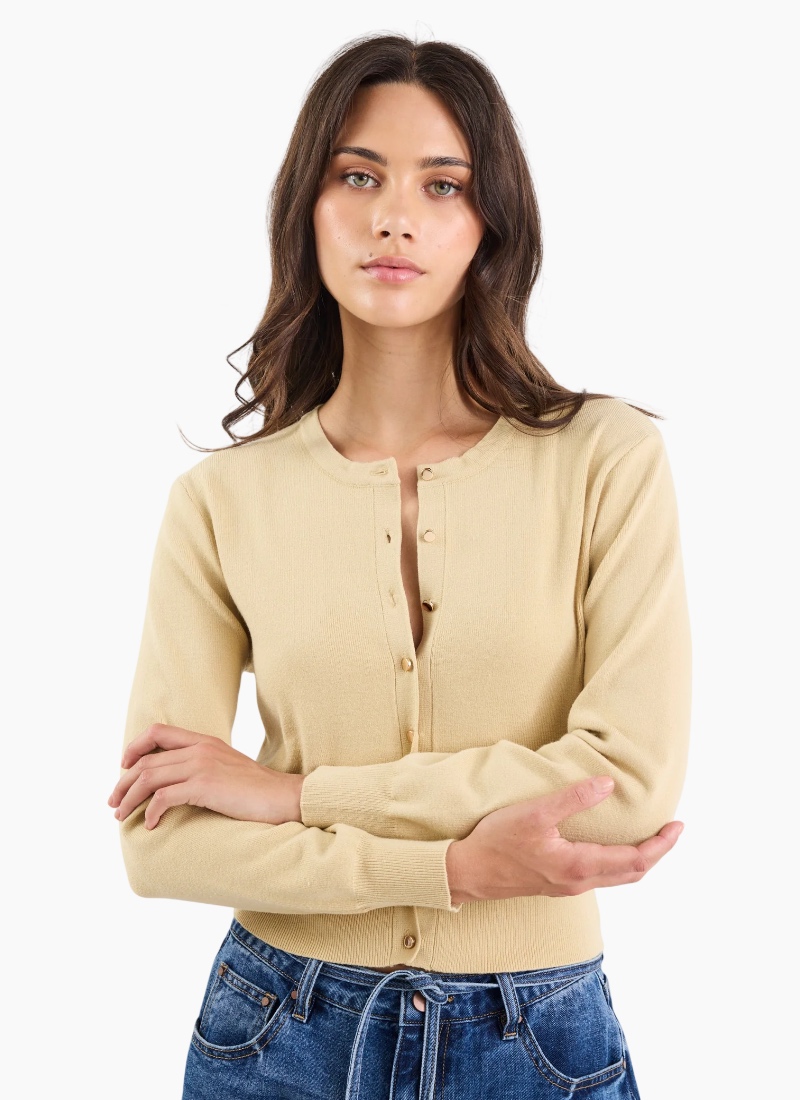 Introducing the Fortune Honey Crewneck Cardigan from Stories Be Told. A refined wardrobe essential in a warm honey colour that adds quiet polish to everyday outfits.