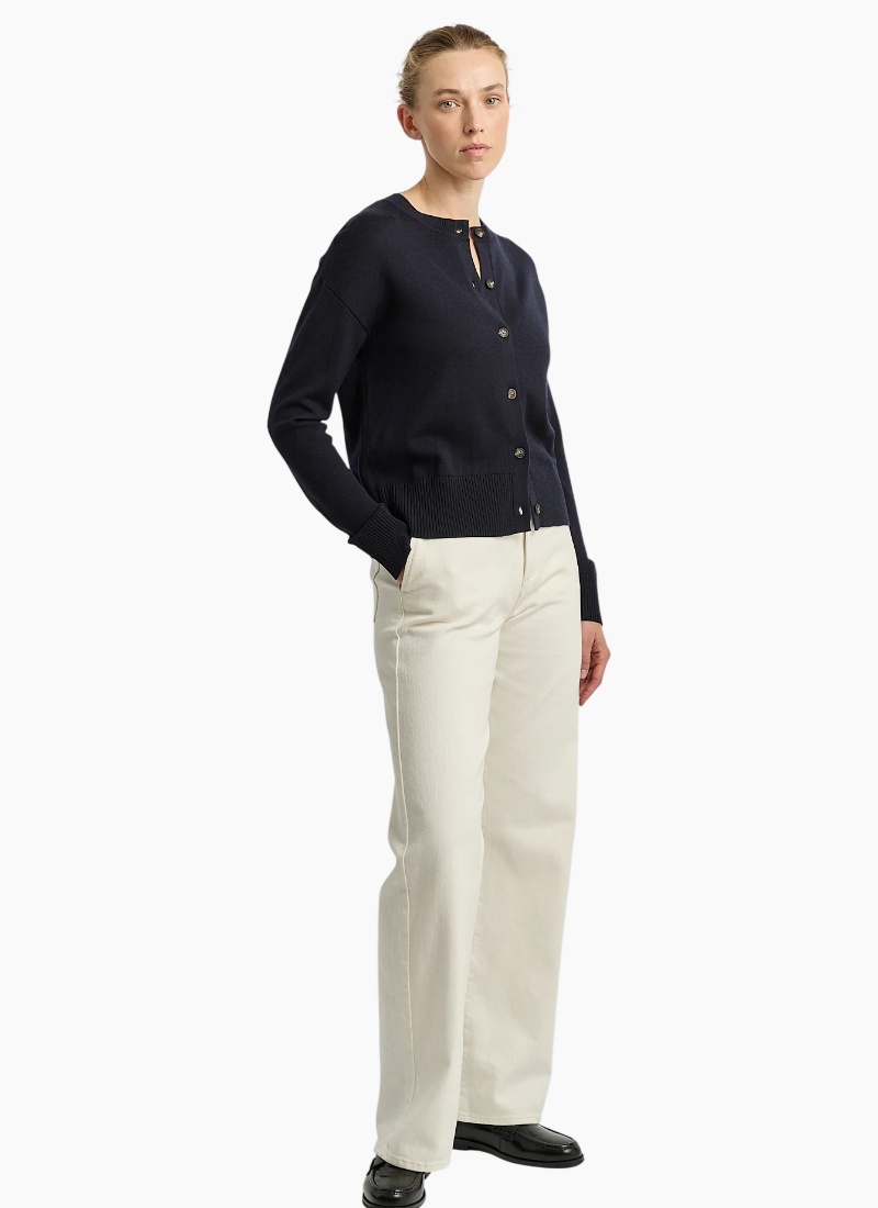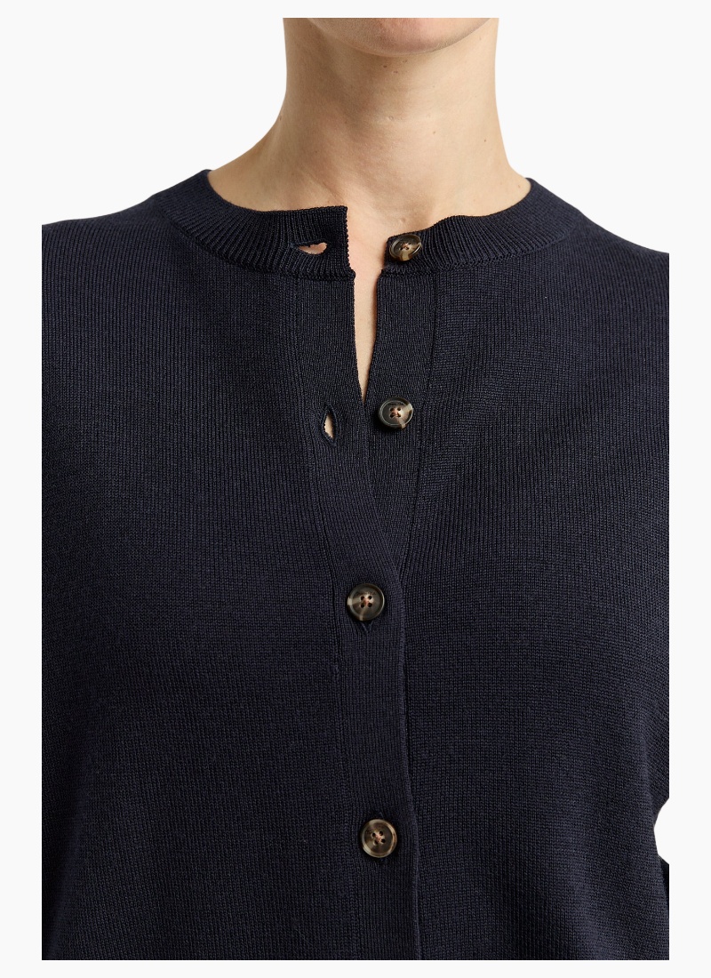 Introducing the Toorallie Fine Knit Cardigan. This navy merino wool cardigan is a refined layering piece that balances simplicity with considered detailing.
