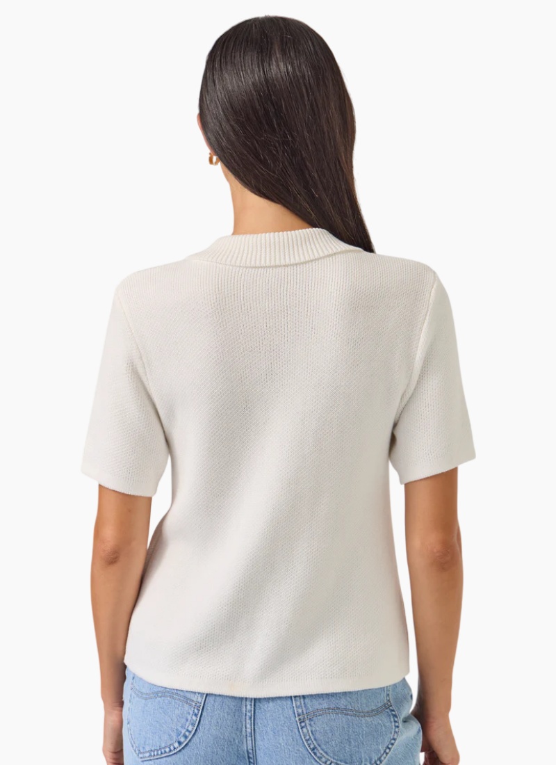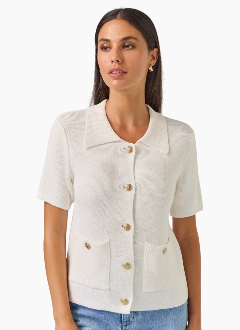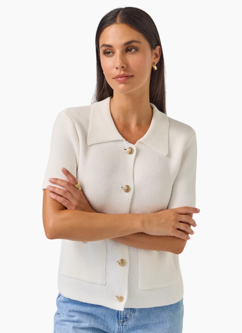 Introducing the Solar Cardi White from Tuesday Label. This timeless white cardigan blends refined tailoring with a soft, textured knit ideal for transitional seasons.