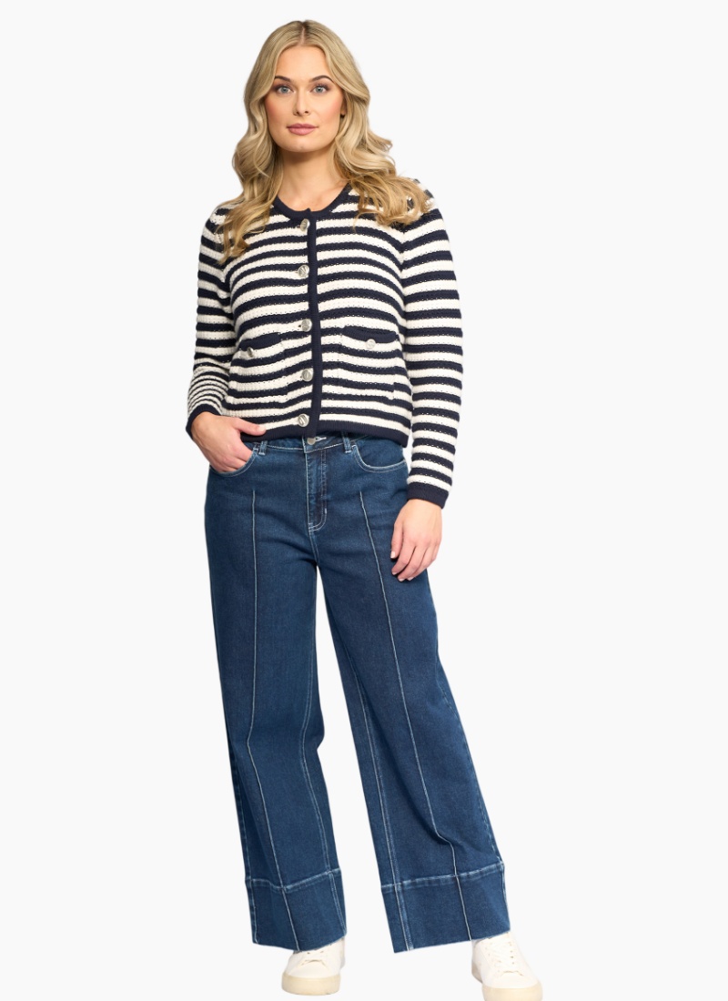 Introducing the Avenue Cardi from Vassalli. This striped navy and white cardigan is a coastal‑inspired layer with a tactile knitted finish that elevates everyday dressing.