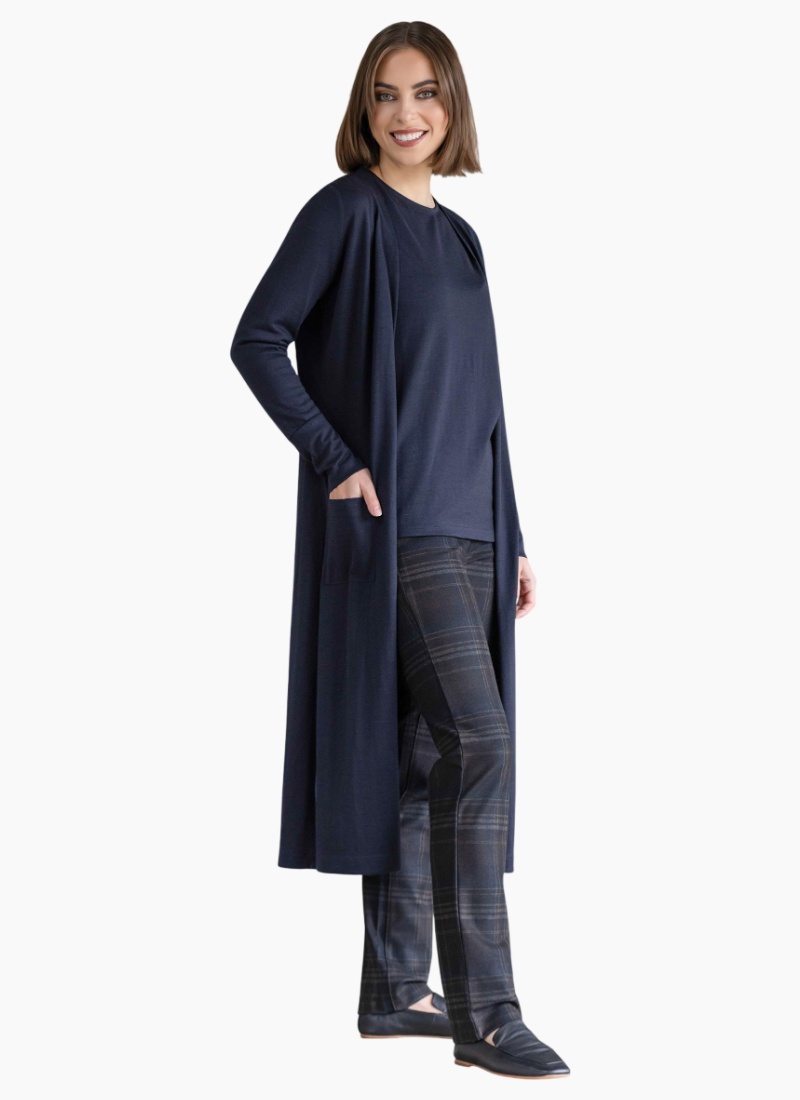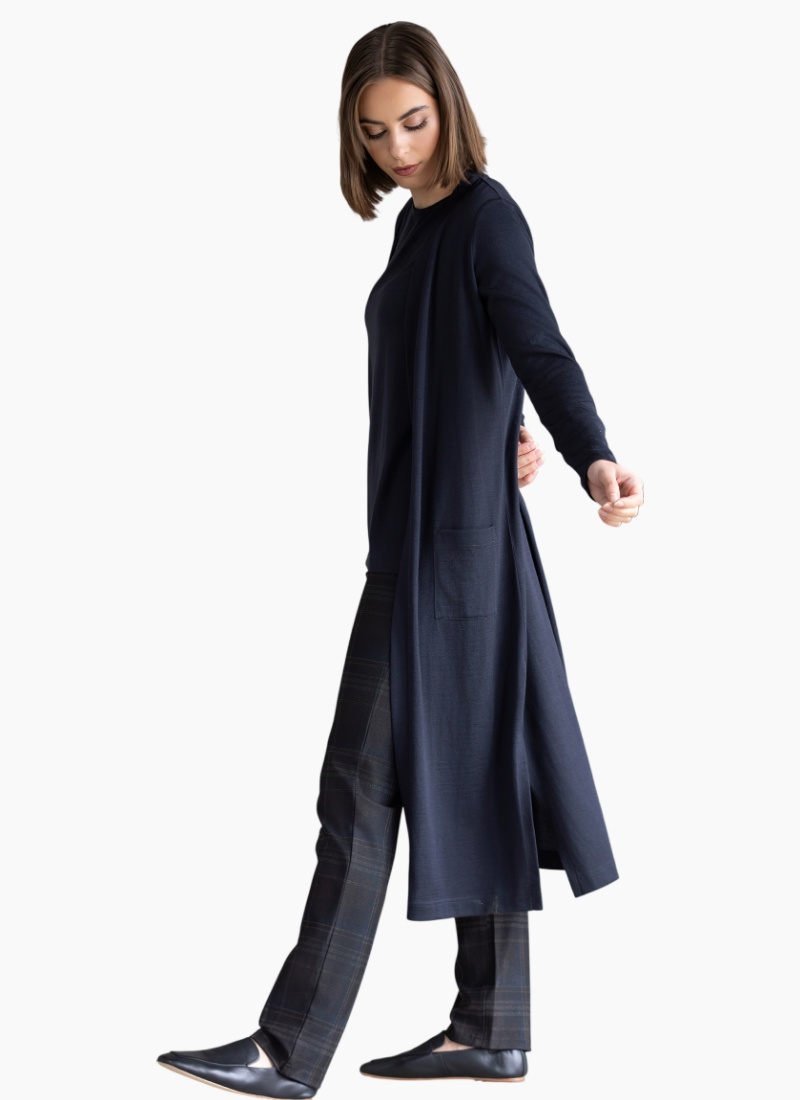 - Midnight from Vassalli. A longline navy cardigan crafted for effortless layering and refined comfort.