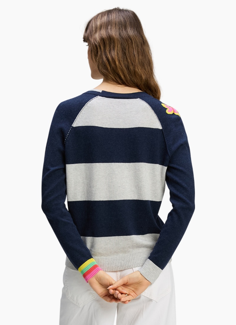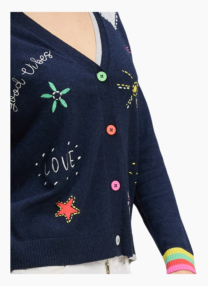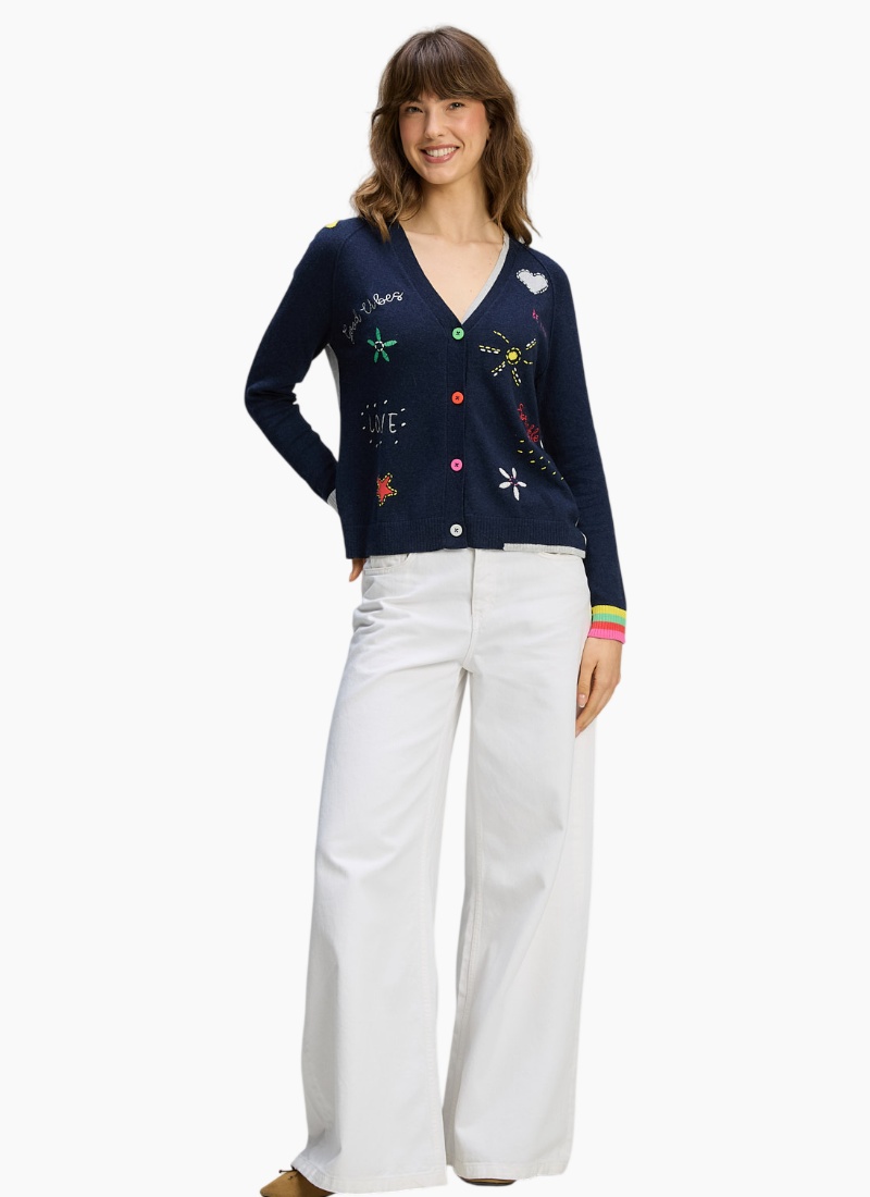 Introducing the Good Energy Cardi from Zaket & Plover. This playful navy cardigan features colourful embroidered motifs and bright trims for an uplifting everyday layer.