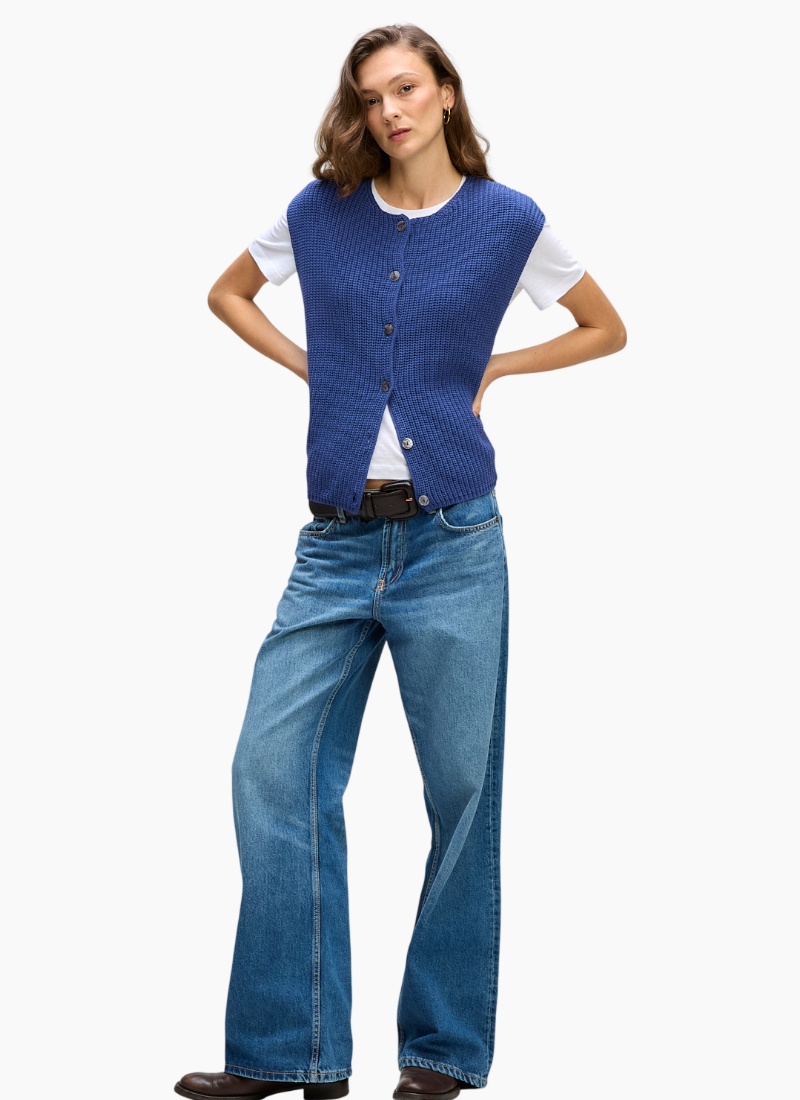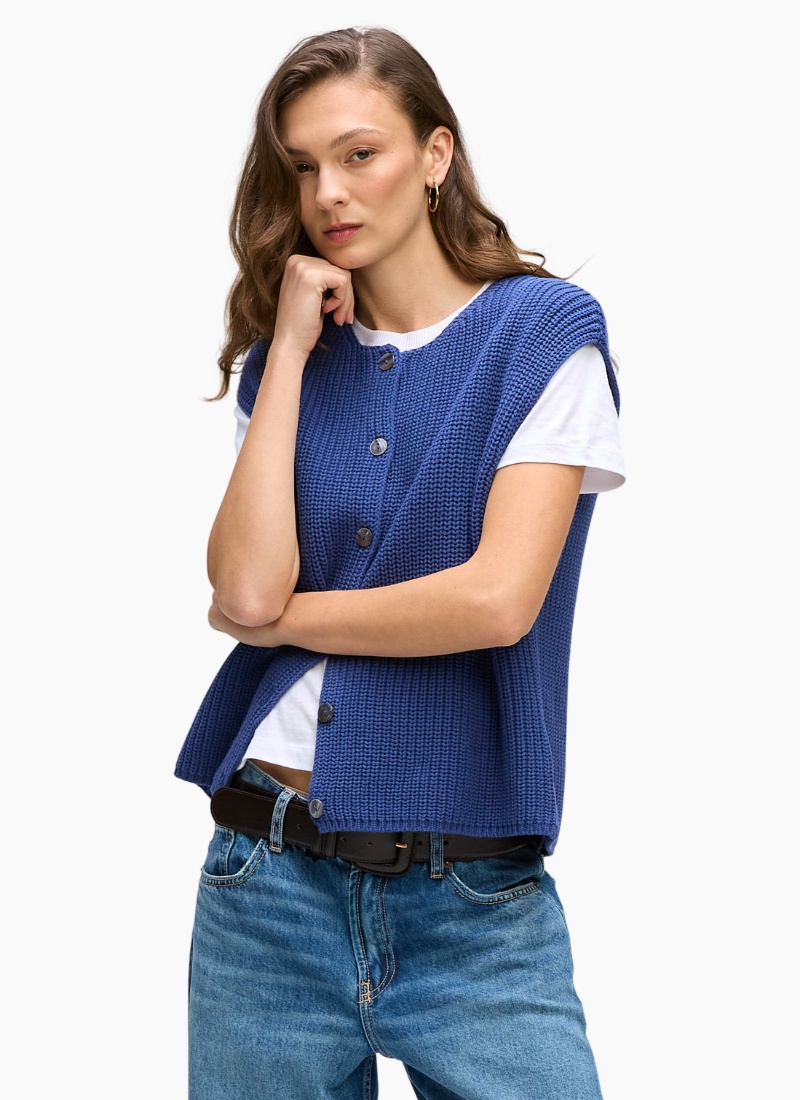 - Cardigan-style sleeveless design with a button-through front, perfect for layering over tees and shirts