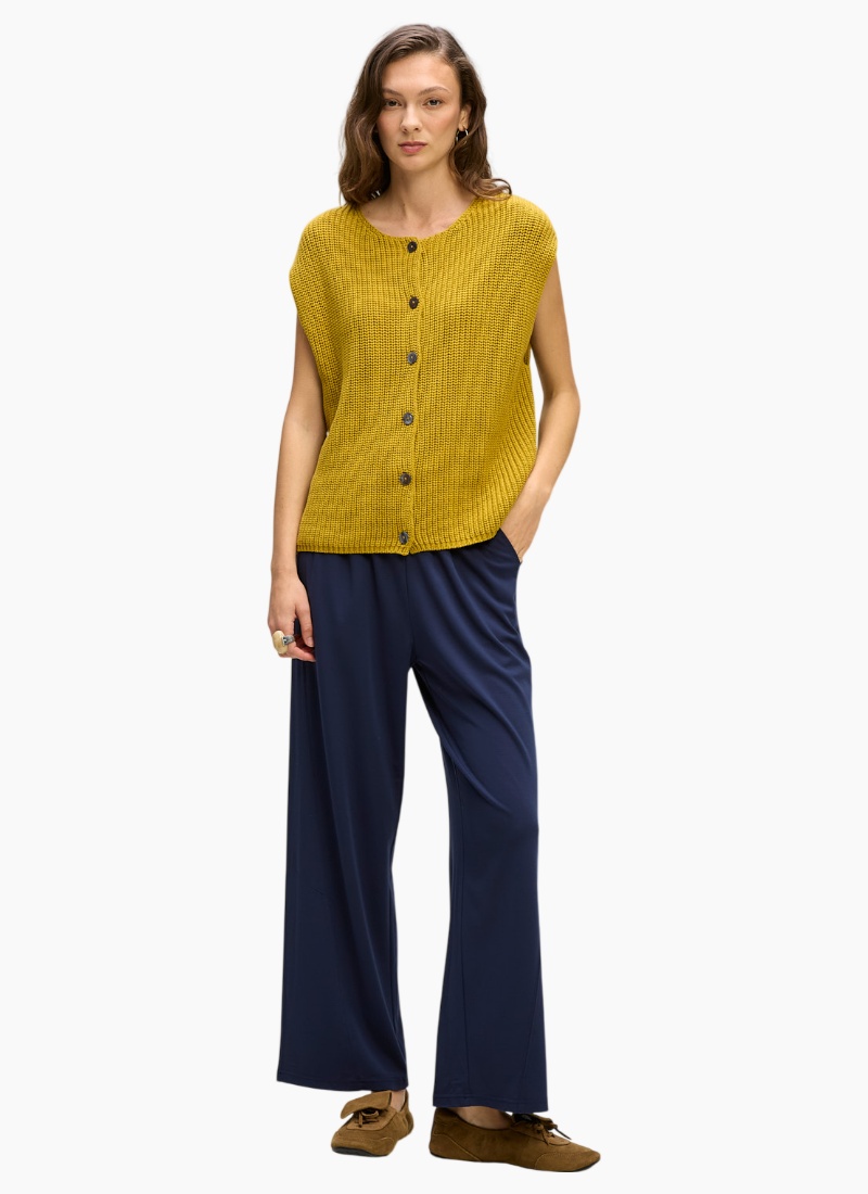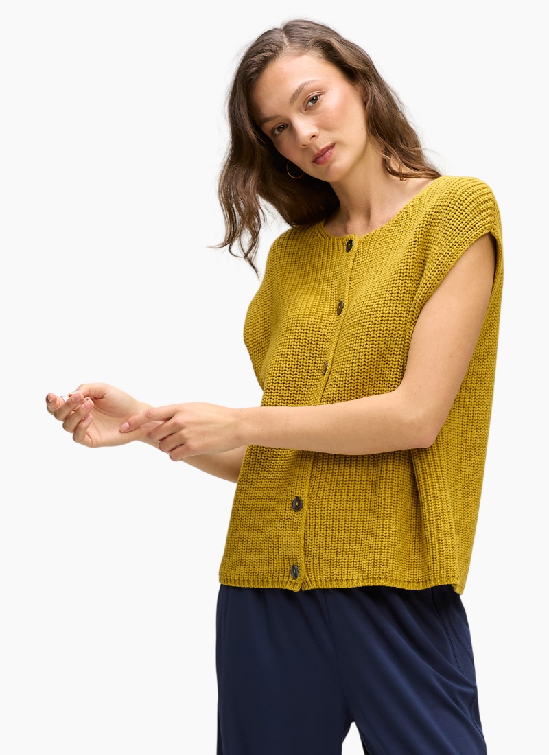 - Button-front design and sleeveless silhouette offer versatile layering within the Cardigans category