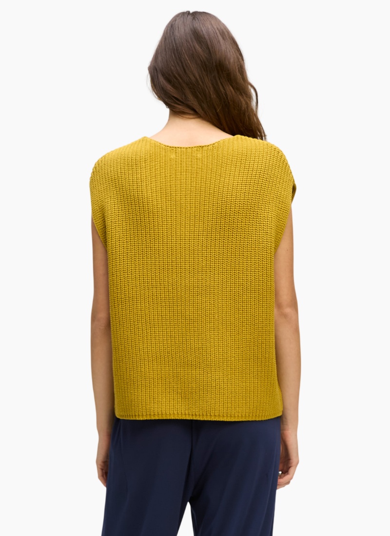 Introducing the Ribbed Vest-Ochre from Zaket & Plover. A cosy, ribbed ochre cardigan crafted to sit beautifully as a layering piece or worn alone for effortless style.