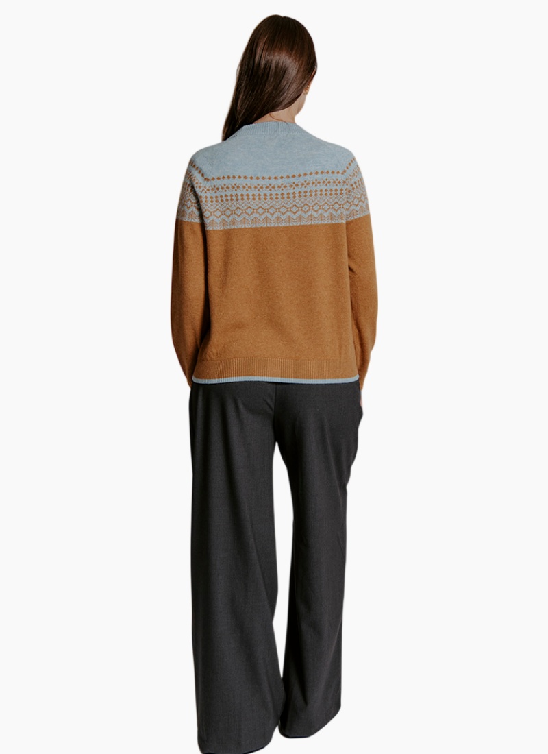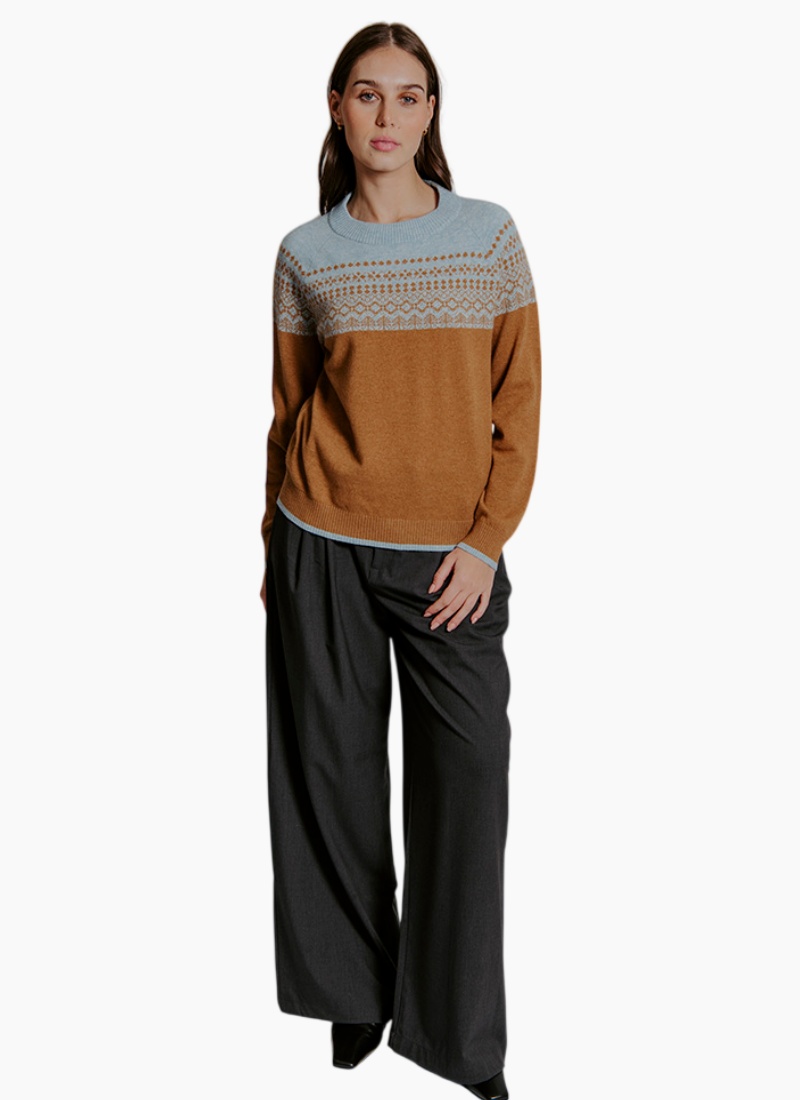Step into timeless style with the Two-Tone Fair Isle Pullover, featuring a classic Fair Isle pattern that blends subtle hues across the yoke with a contrasting solid base. This pullover offers cozy warmth and enduring charm, making it a perfect addition to your autumn and winter wardrobe. The combination of soft knit fabric and elegant detailing creates a versatile piece that complements both casual and dressier looks. • Traditional Fair Isle patterned yoke in two-tone colour scheme. • Comfortable crew neck design for easy layering. • Soft, warm knit fabric ideal for cooler weather. • Ribbed cuffs, hem, and neckline for a polished finish. • Relaxed fit that balances comfort and style, easily worn with a variety of bottoms.