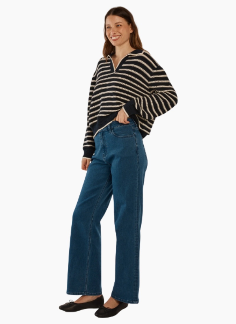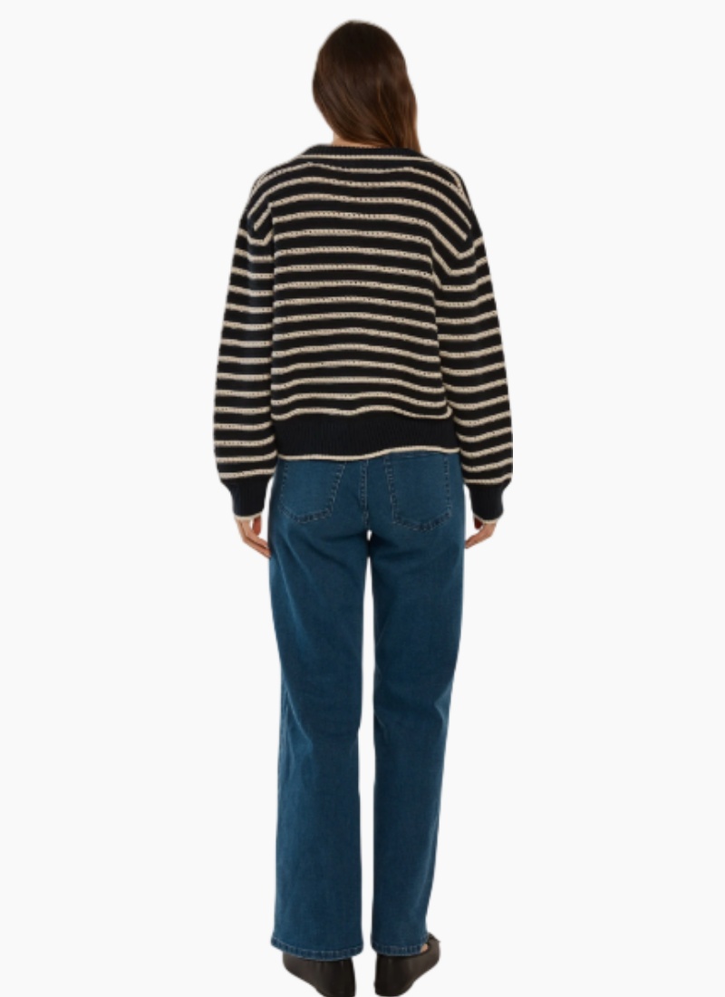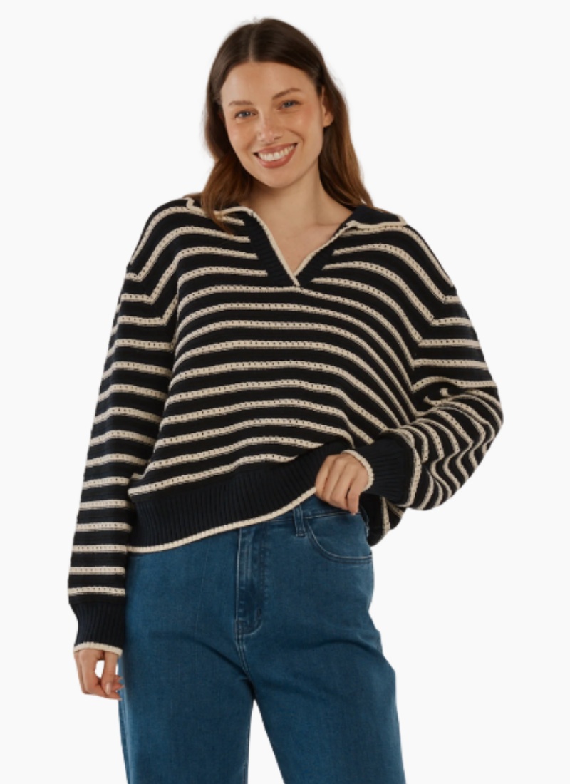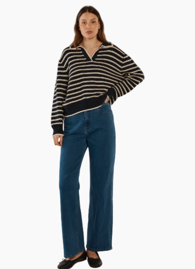 Introducing the ABERDEEN POLO KNIT SWEAT from Betty Basics. This relaxed striped jumper brings effortless charm to your everyday wardrobe. The Aberdeen Polo Knit Sweater is an elevated take on everyday knitwear, designed for comfortable, trans-seasonal wear. Crafted from a soft knit fabrication, it features an all-over stripe design with a classic polo neckline for a polished finish. Ribbed cuffs and hem add subtle structure while maintaining an effortless feel. An easy, relaxed style you’ll reach for again and again.
