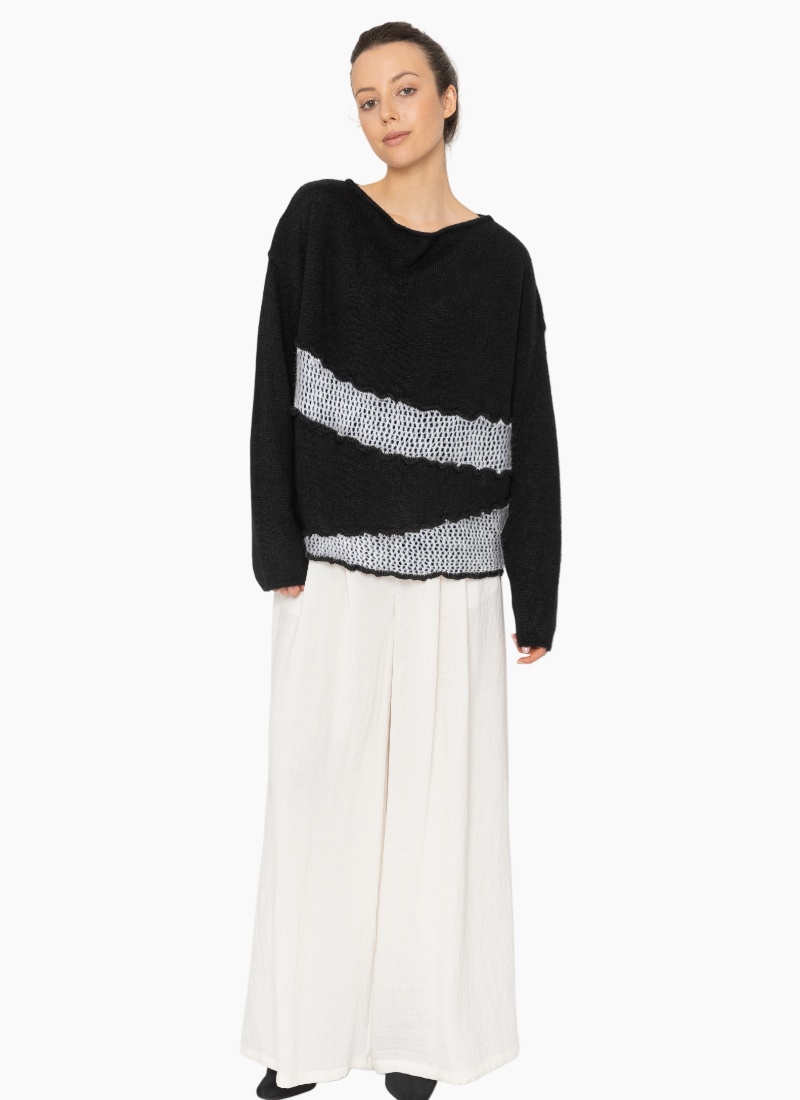 - Deep black base with contrasting white open-knit bands for subtle graphic detail and modern colour contrast