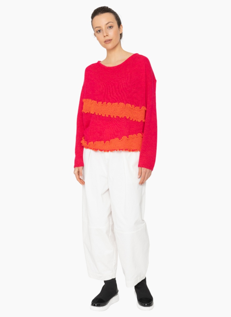 • Bright hot pink body with contrasting orange ruffle stripes for sculptural, feminine detail