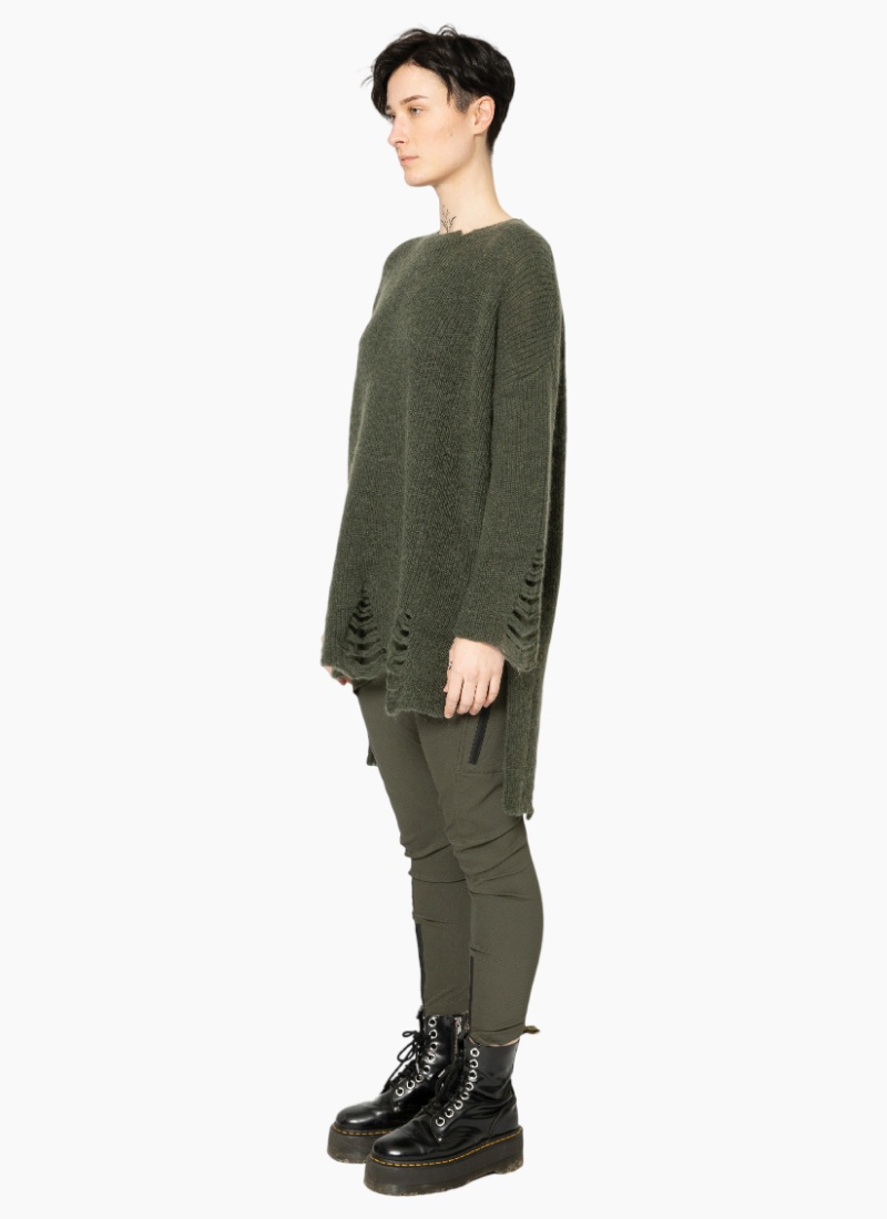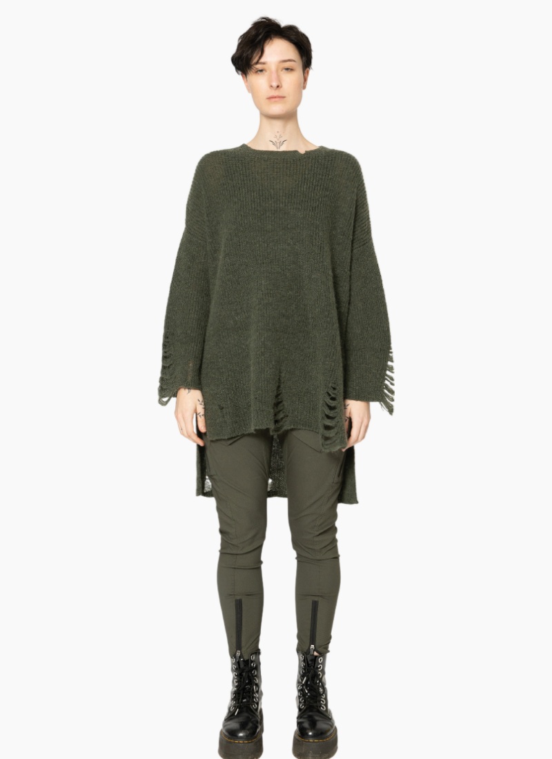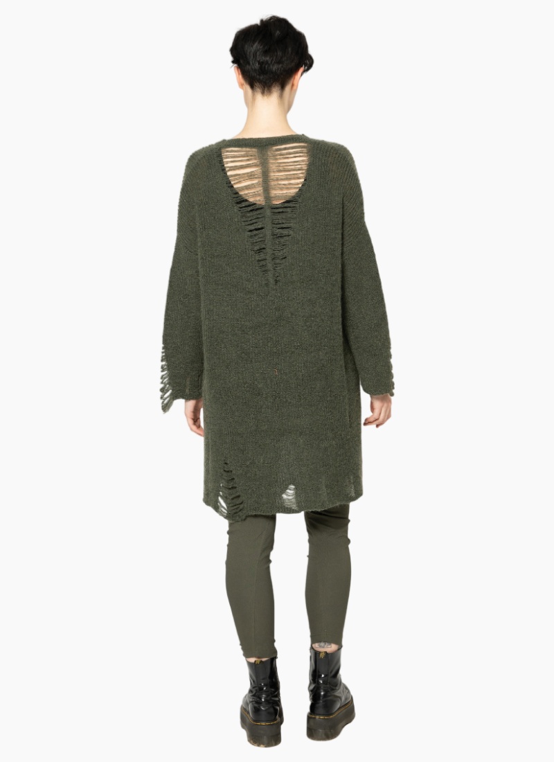 - Rendered in a deep dark green colour with ladder-knit distressing at the hem and cuffs for subtle edge
