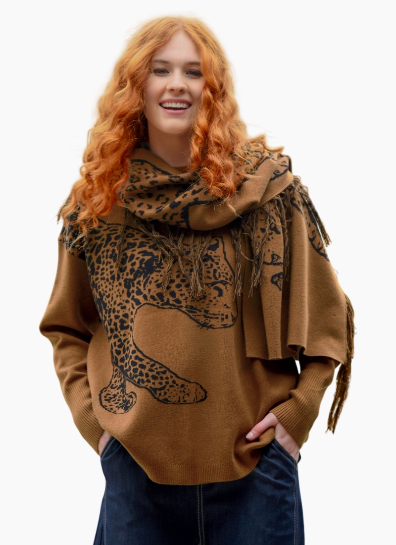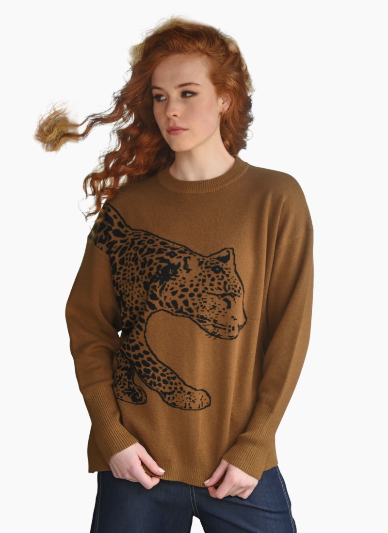 Wrap yourself in celestial comfort with the 'Mitten in the Stars' jumper, crafted from our luxurious 'Strong Yarn Ready' knit blend. Fully fashioned with an all-over leopard motif, it brings a touch of wild elegance to cooler days. The relaxed silhouette drapes effortlessly, making it the perfect throw-on piece for everyday wear with a hint of star-struck charm. • Jacquard knit • Leopard motif • Relaxed silhouette