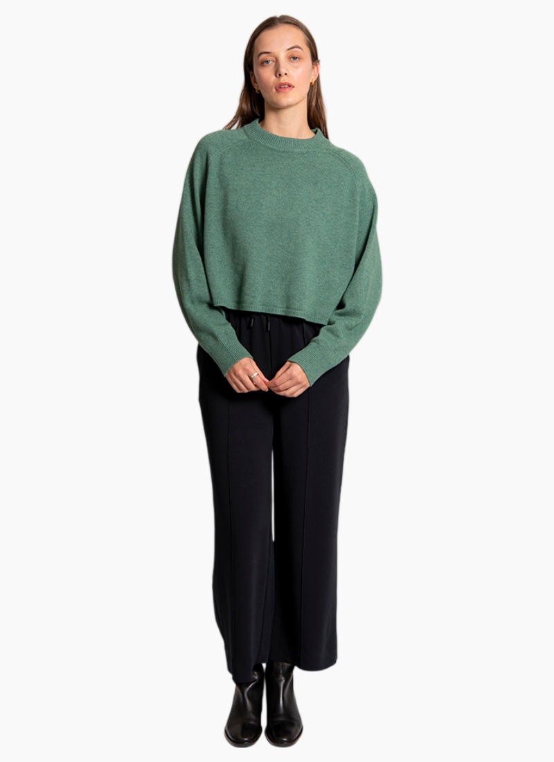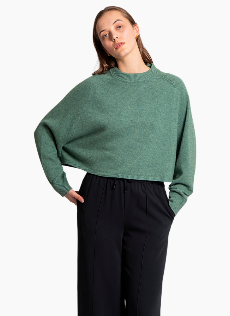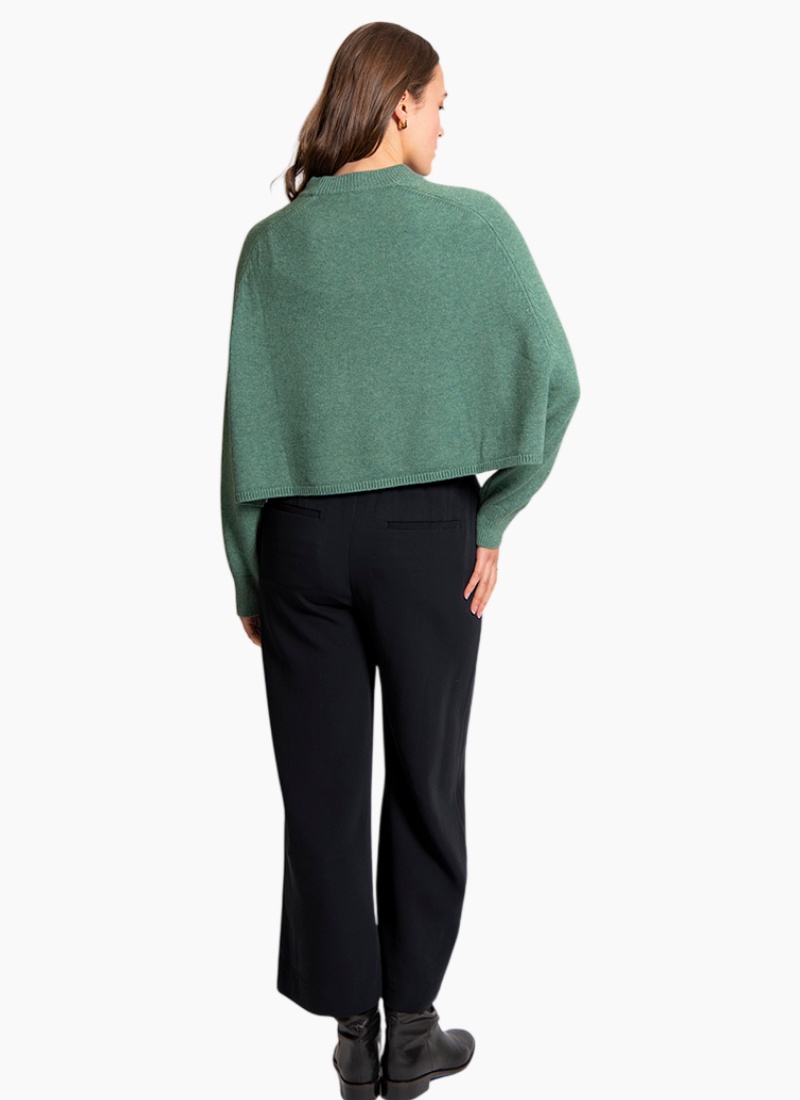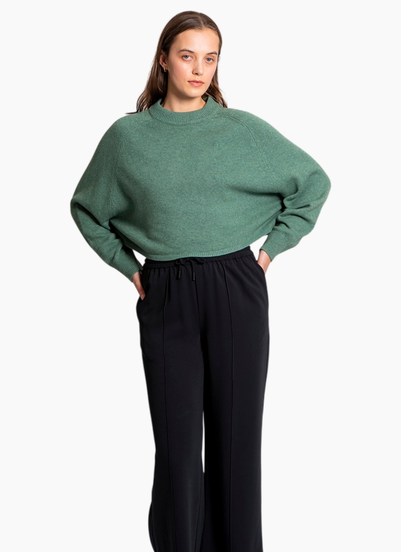 This pullover combines softness, warmth, and breathability, making it suitable for cooler seasons while maintaining a stylish, contemporary look • Features a loose, batwing sleeve with a saddle shoulder silhouette • Has a cropped, boxy fit • The neckline, cuffs, and hem have a subtle ribbed knit finish • Great for layering or wearing on its own for a cozy yet polished look