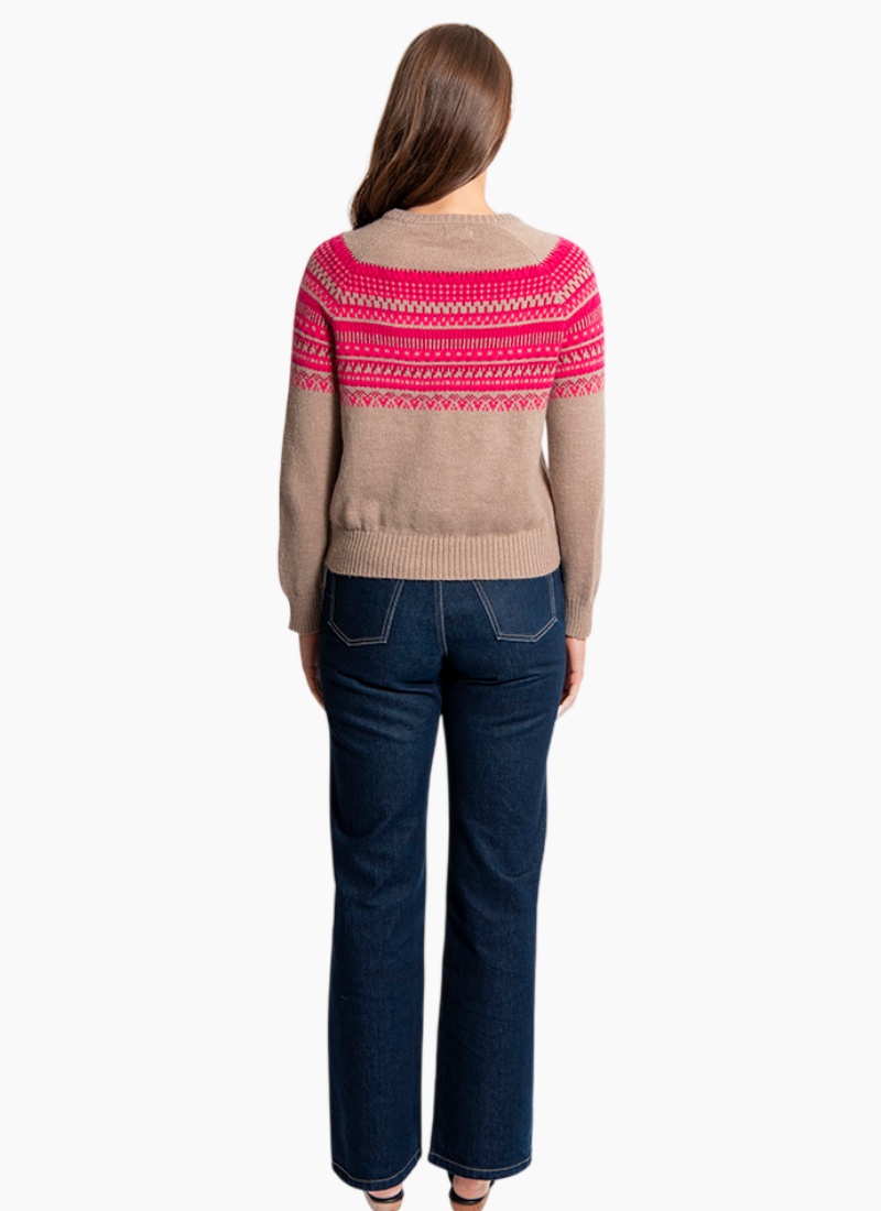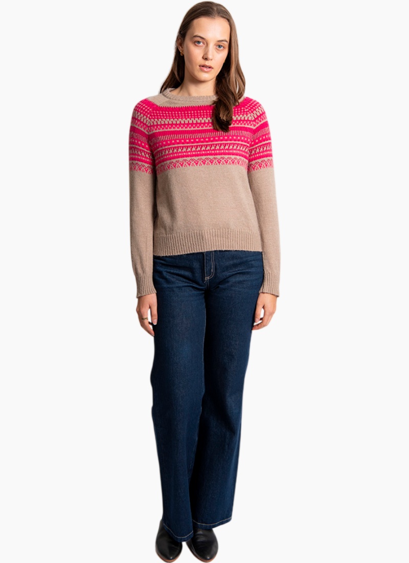Wrap yourself in timeless warmth and classic style with our Fair Isle Pullover. This Fair Isle Pullover is a perfect blend of cozy, lightweight warmth and artisanal patterning, ideal for anyone seeking to add a touch of classic knitwear charm to their wardrobe. • Traditional Fair Isle pattern across the yoke in soft, earthy tonal contrasts • Classic crew neckline with ribbed finish for a neat look and comfortable fit • Long sleeves with ribbed cuffs and a slightly cropped, boxy silhouette for a modern take on a heritage design • Ribbed hem adds shape and polish