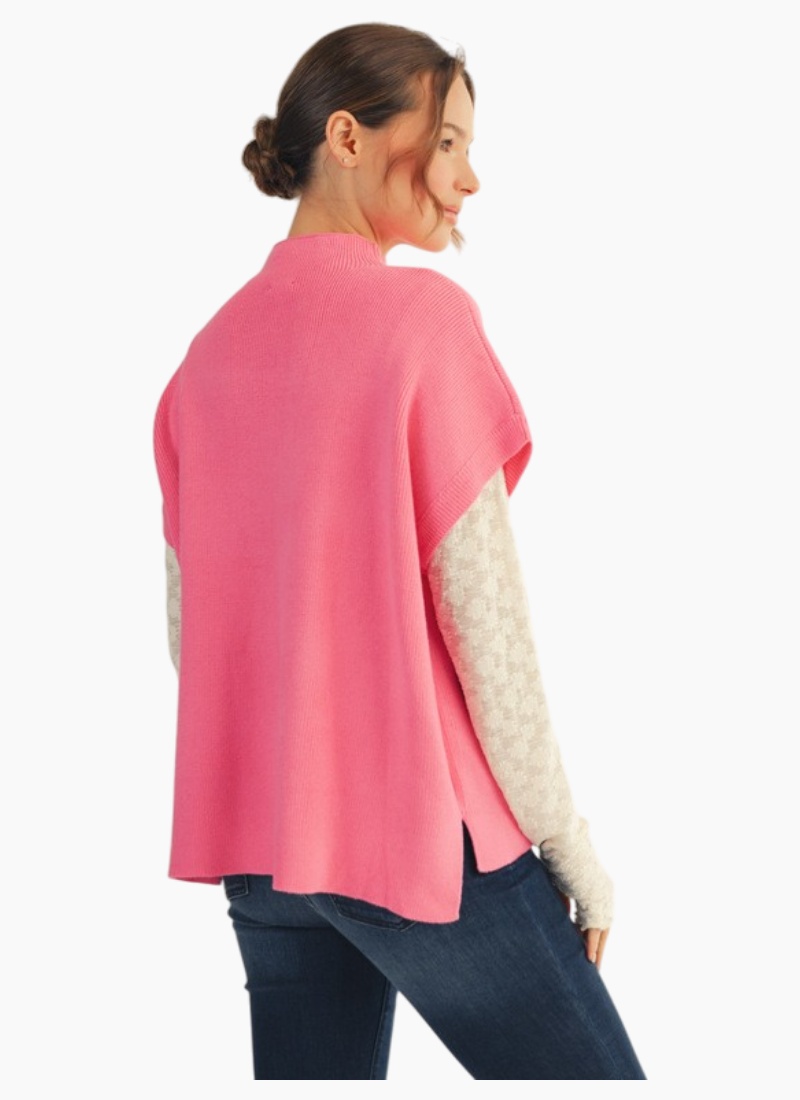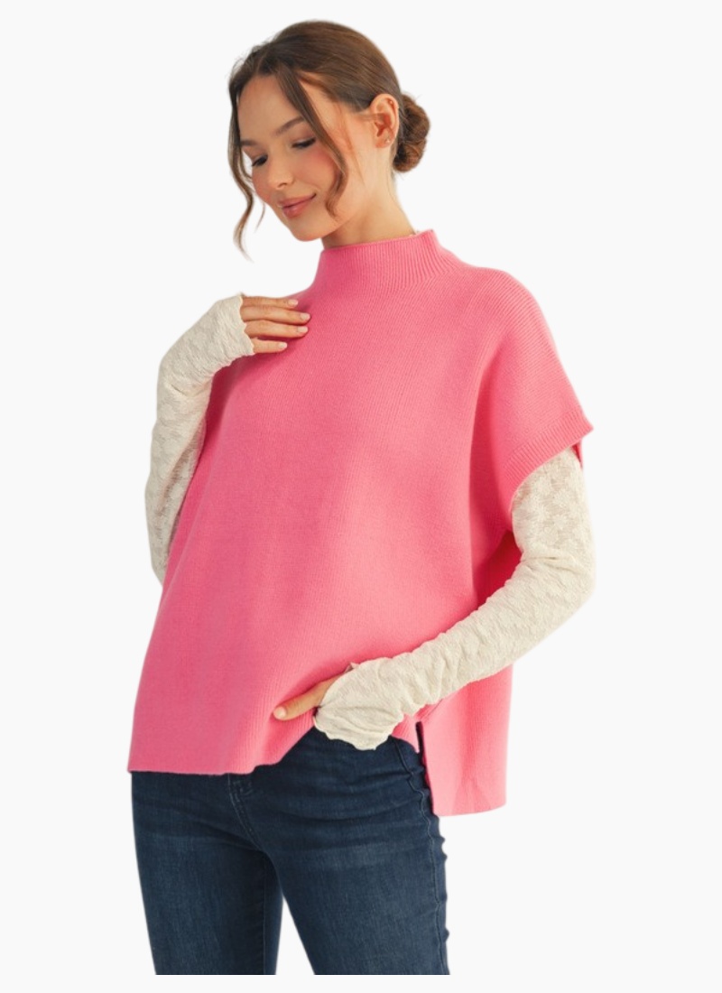 Drop shoulder mock neck sweater top with side slit detail.