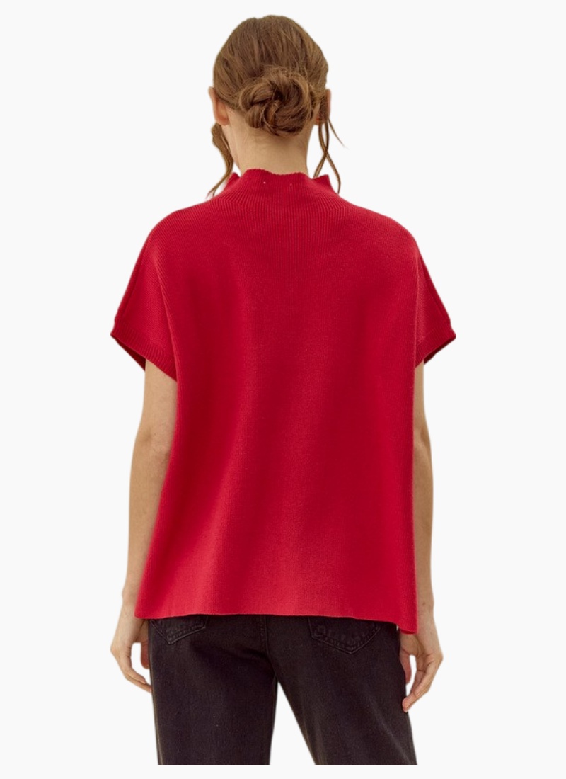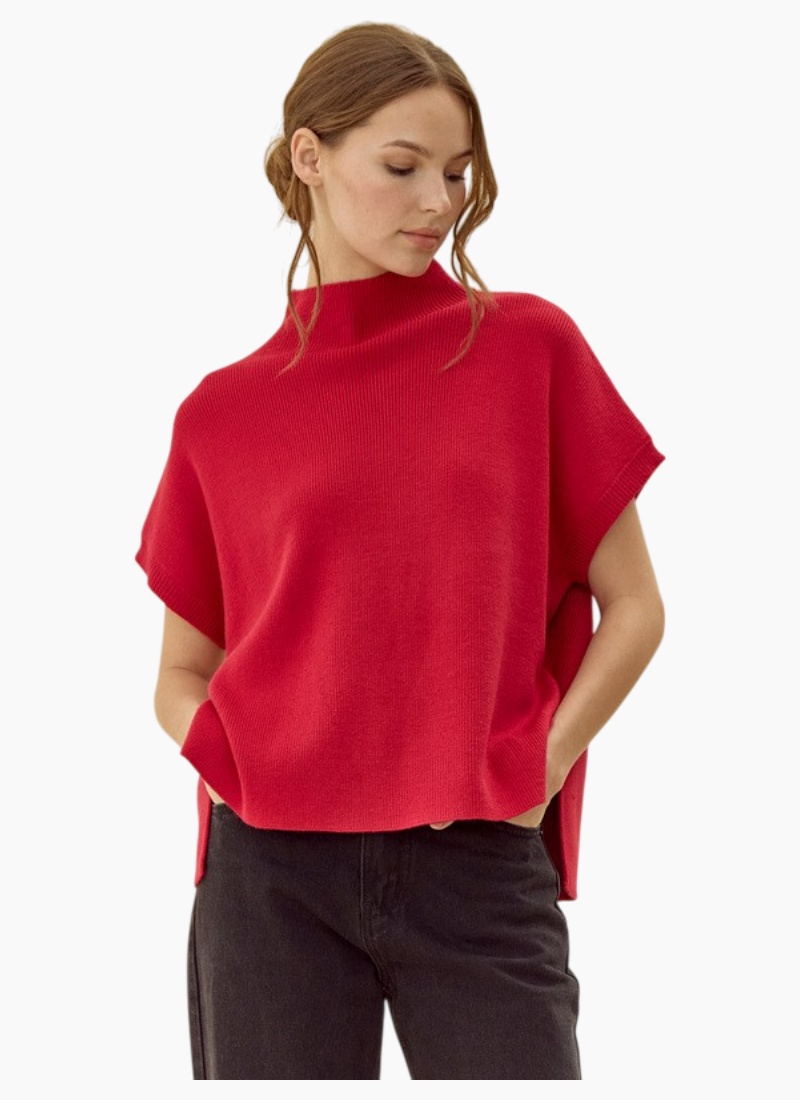 Drop shoulder mock neck sweater top with side slit detail.