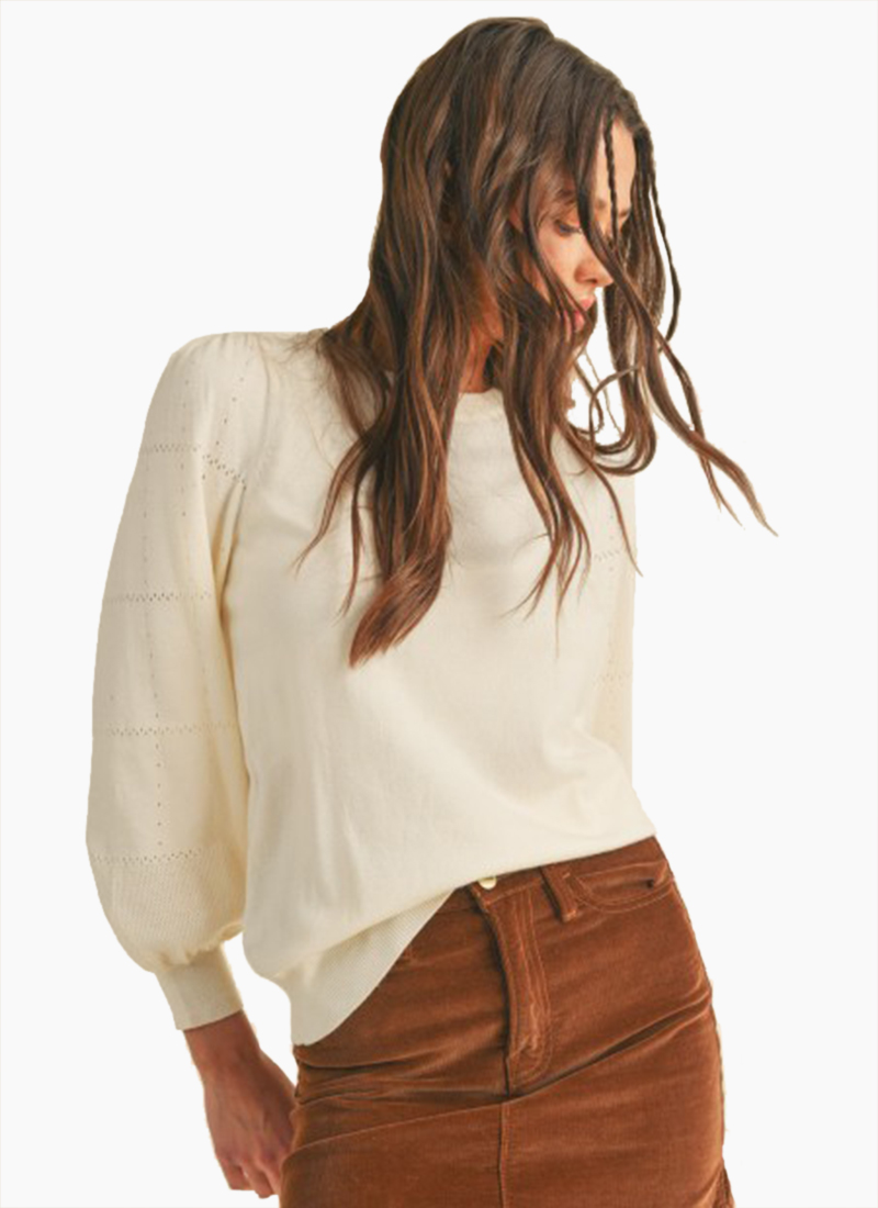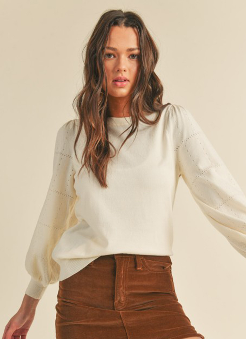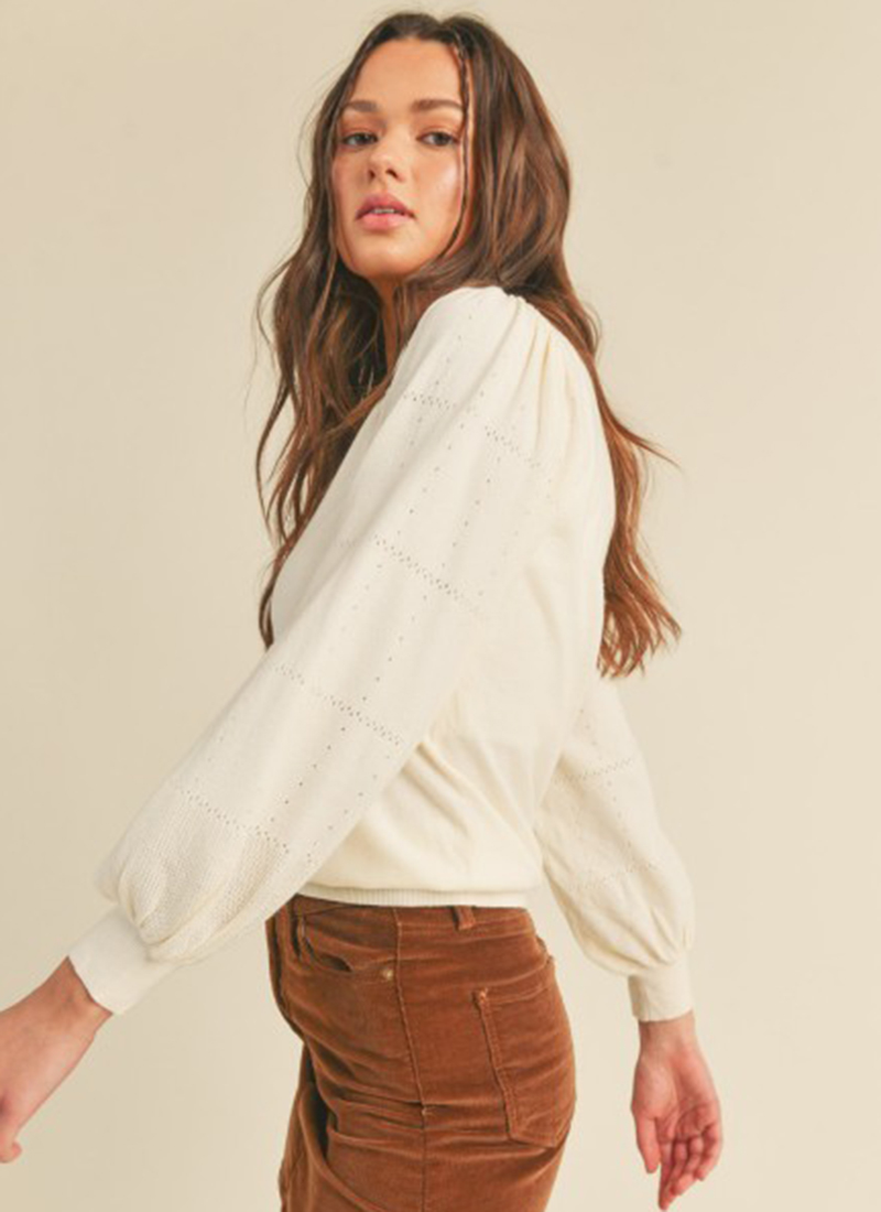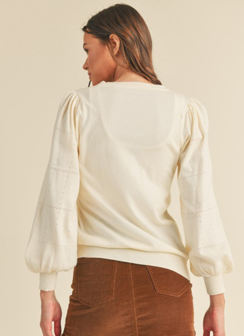 Lightweight knit sweater with contrast puff sleeves in a pointelle knit